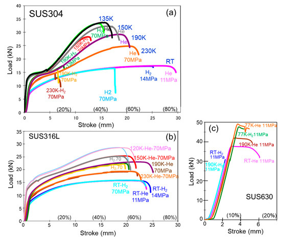 Load–stroke curves for (a) SUS304, (b) SUS316L, and (c) SUS630 at room temperature (RT) and low temperatures in 11 MPa or 70 MPa hydrogen or helium gas using the hollow specimen.