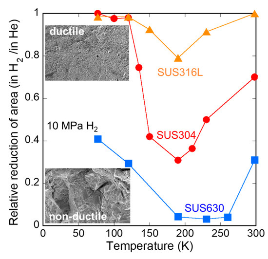 SUS630 showed a significant influence of H2, and the specimens failed before reaching the yield strength, except at 77 K. In SUS630, the influence of H2 was maximum at approximately 230–250 K [20].
