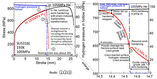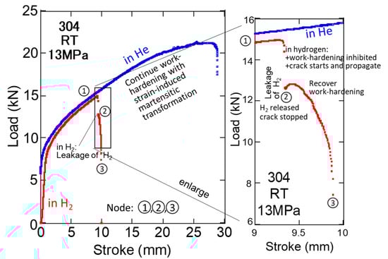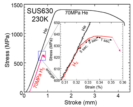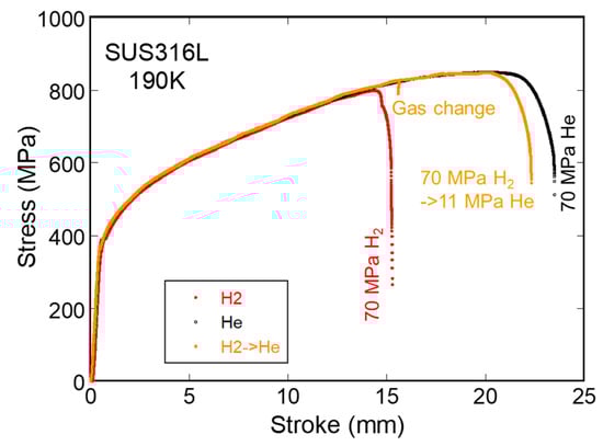 The stress–stroke curves for SUS 304 at 13 MPa H2 and He at RT are shown in Figure 10, and the same phenomenon can be observed. These phenomena for SUS 304, 316L, and other meta-stable austenitic steels occur frequently at lower temperatures owing to the influence of H2 on the strain-induced martensitic transformation during work hardening.