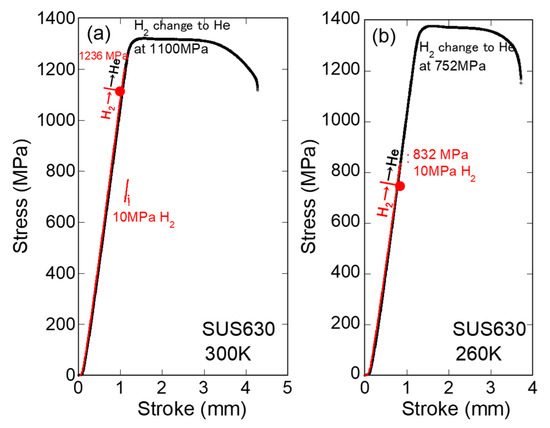 Stress–stroke curves of SUS630 at 300 K (a) and 260 K (b) in 10 MPa hydrogen, where hydrogen was replaced with helium gas just below the fracture stress in hydrogen [18] (red lines indicate H2).