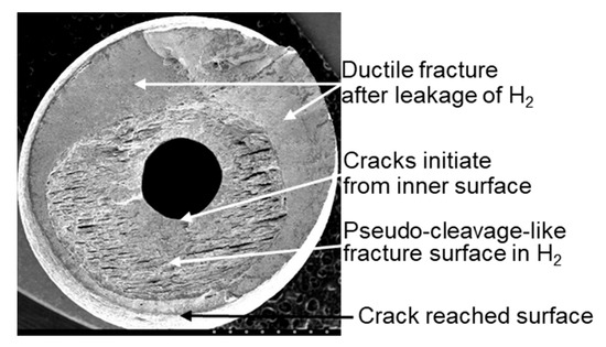 The phenomenon that the apparent stress drop stopped immediately after the hydrogen leakage might be explained by the relaxation of the stress at the crack tip due to the loss of internal pressure; however, the stress due to the internal pressure was small [21]. As shown in Figure 8 and Figure 10, the stress increased after the pressure drop, and the slope of the drop was close to that in He, which indicated that the effect of hydrogen disappeared, and work hardening resumed. The fact that the rapid crack growth by H2 stopped immediately after the release of H2 can be explained by the assumption that the rapid crack growth is not due to the accumulation of defects but to the interruption by H2 of work hardening in the process of increasing the strength to withstand the increase in applied stress.