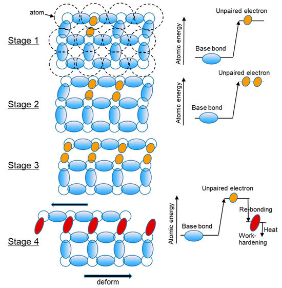 Stage 2: The bonded orbital electrons to be re-bonded are excited by energy to become unpaired electrons. If unable, they return to the original state with AE (acoustic emission) or heat generation. A large number of aligned unpaired electrons are required for re-bonding.