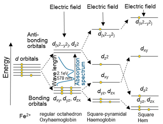 When a force is applied from the surroundings that exceeds the original bonding force of a substance, the bonding force is increased to correspond to the force to reduce the change, as in self-induction. It is considered that the splitting of the orbital occurs not only by the electric field but also by stress. Figure 13 presents a familiar illustration of the splitting of the d orbitals of iron by the electric field and excitation energy. It can be inferred that this is true not only when electric field energy is applied but also when a force is applied.