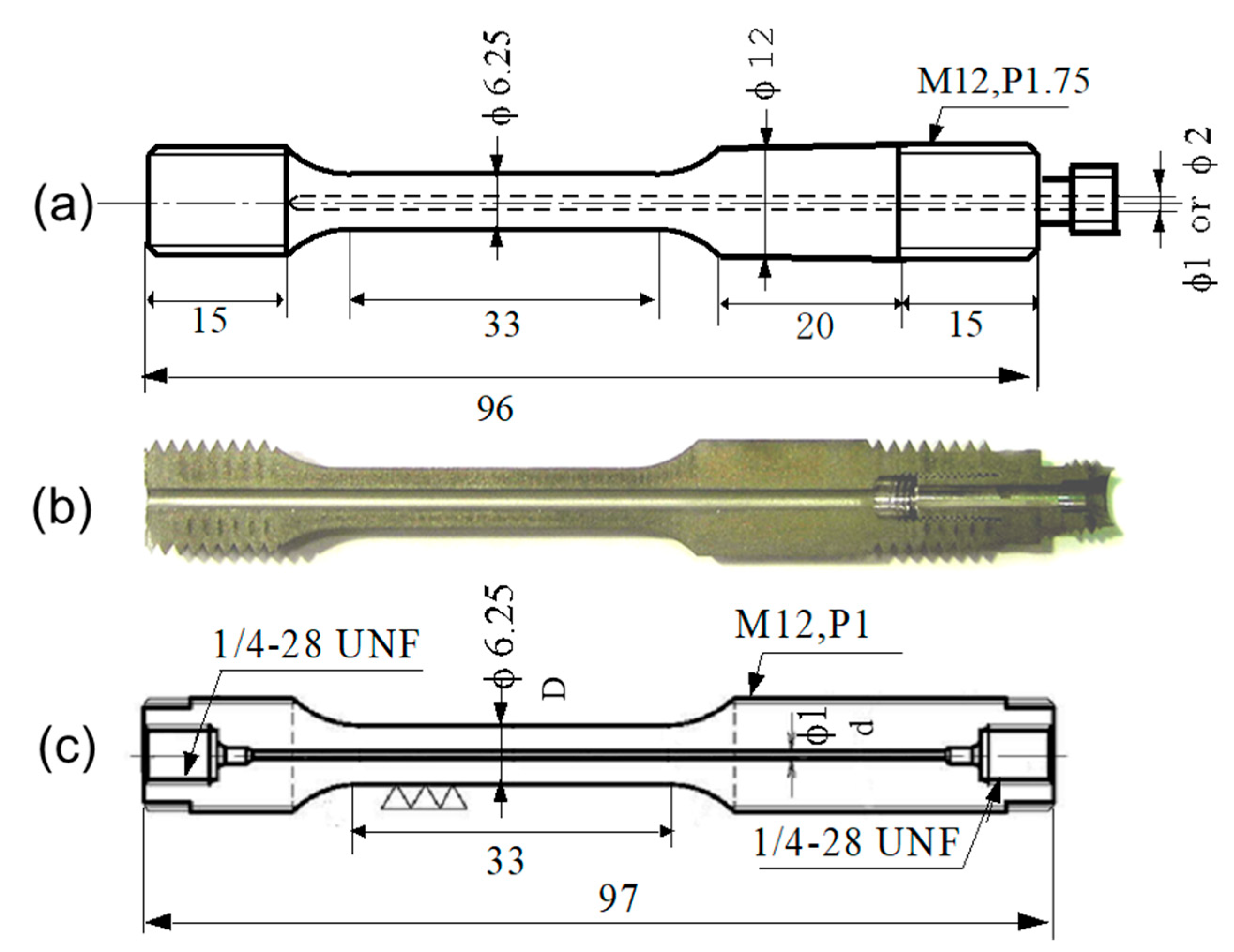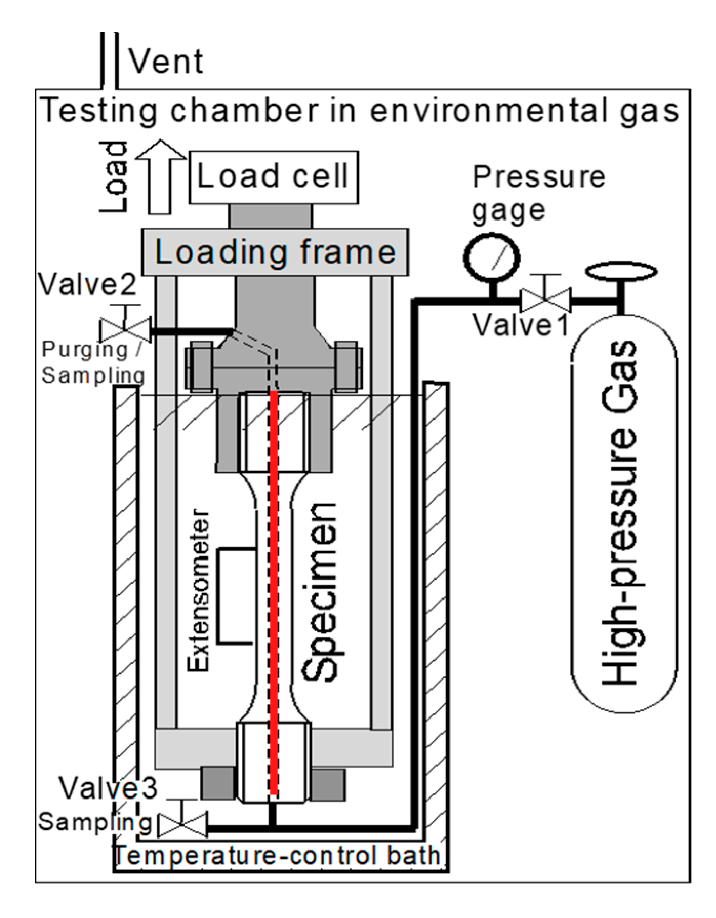 Figure 2 shows an illustration of the testing system with the hollow specimen for evaluating the mechanical properties under high-pressure hydrogen gas. The high-purity (7N grade) hydrogen gas (H