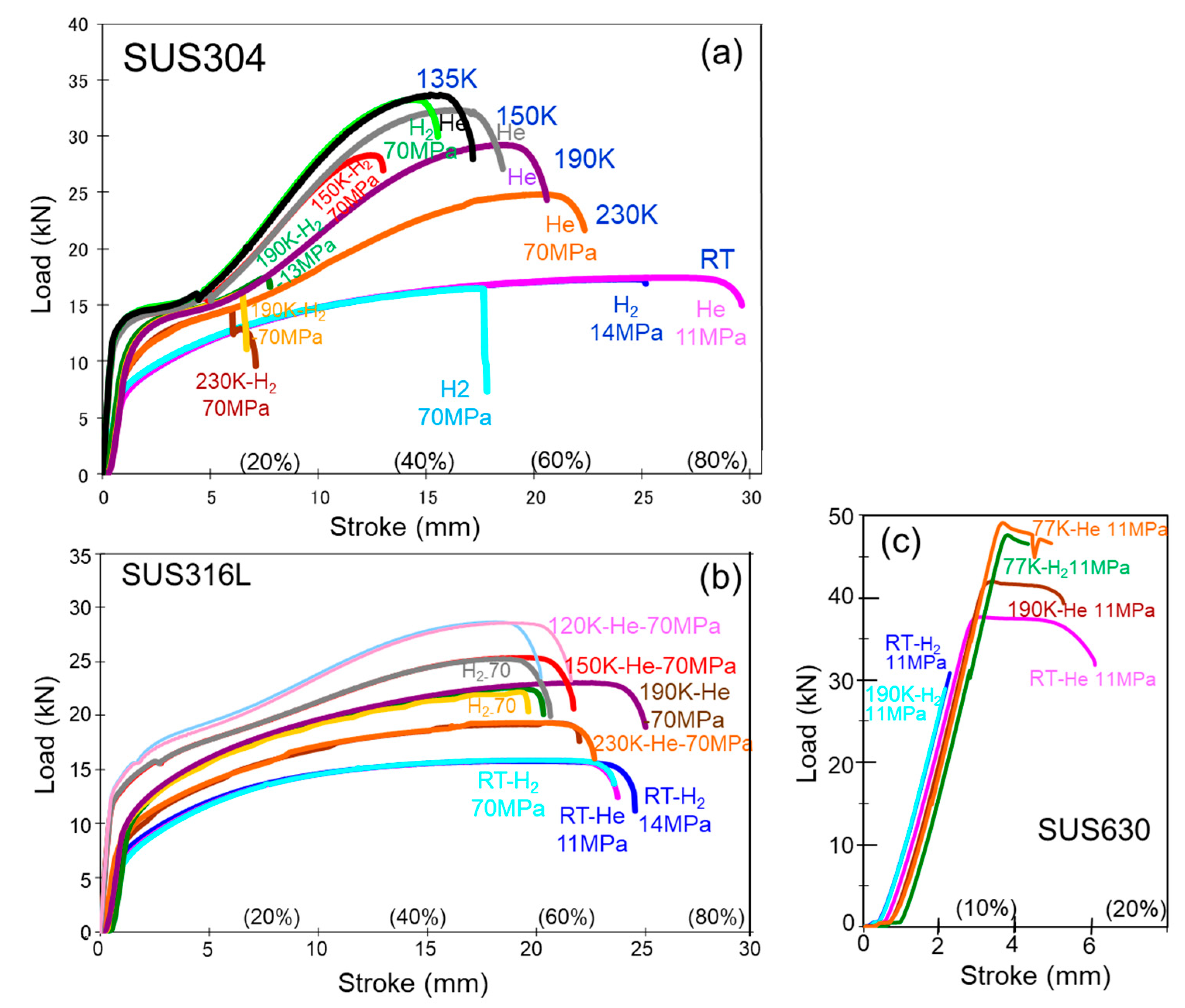 Table 1. SUS316L, with its stable austenite phase, is less affected by hydrogen. SUS304, with its low Ni content and no Mo, has an unstable austenite phase and is affected by hydrogen when it transforms into martensite, but it is cheaper than SUS316L. SUS630 is a martensitic stainless steel with high strength but it is easily affected by hydrogen. Typical austenitic stainless steels, SUS304 and 316L, were solution-treated at 1323 K for 0.5 h. The heat treatment of martensitic stainless steel SUS630 was as follows: 1303 K × 1 h, water-quenching, 753 K × 10 h, and air-cooling.