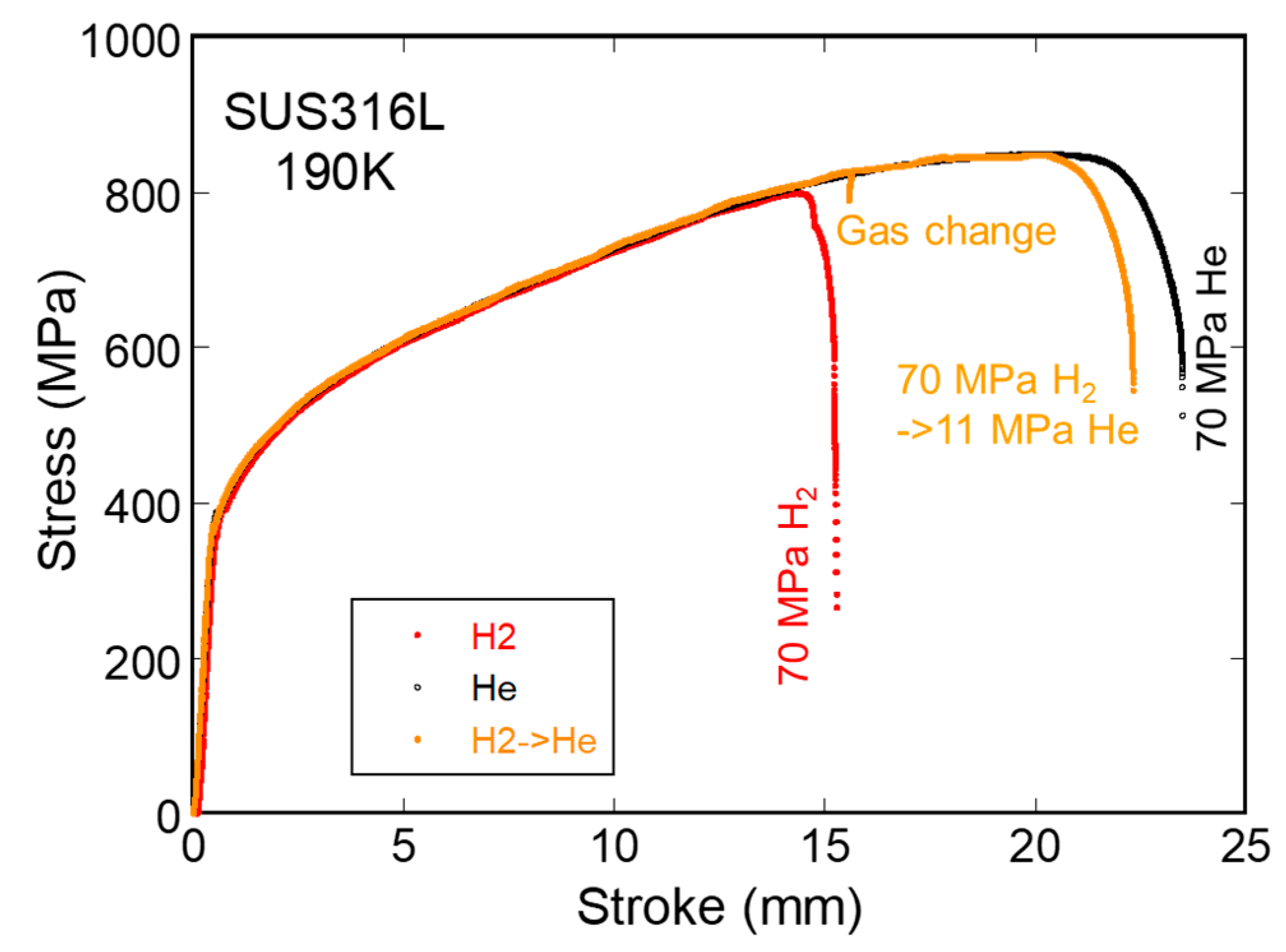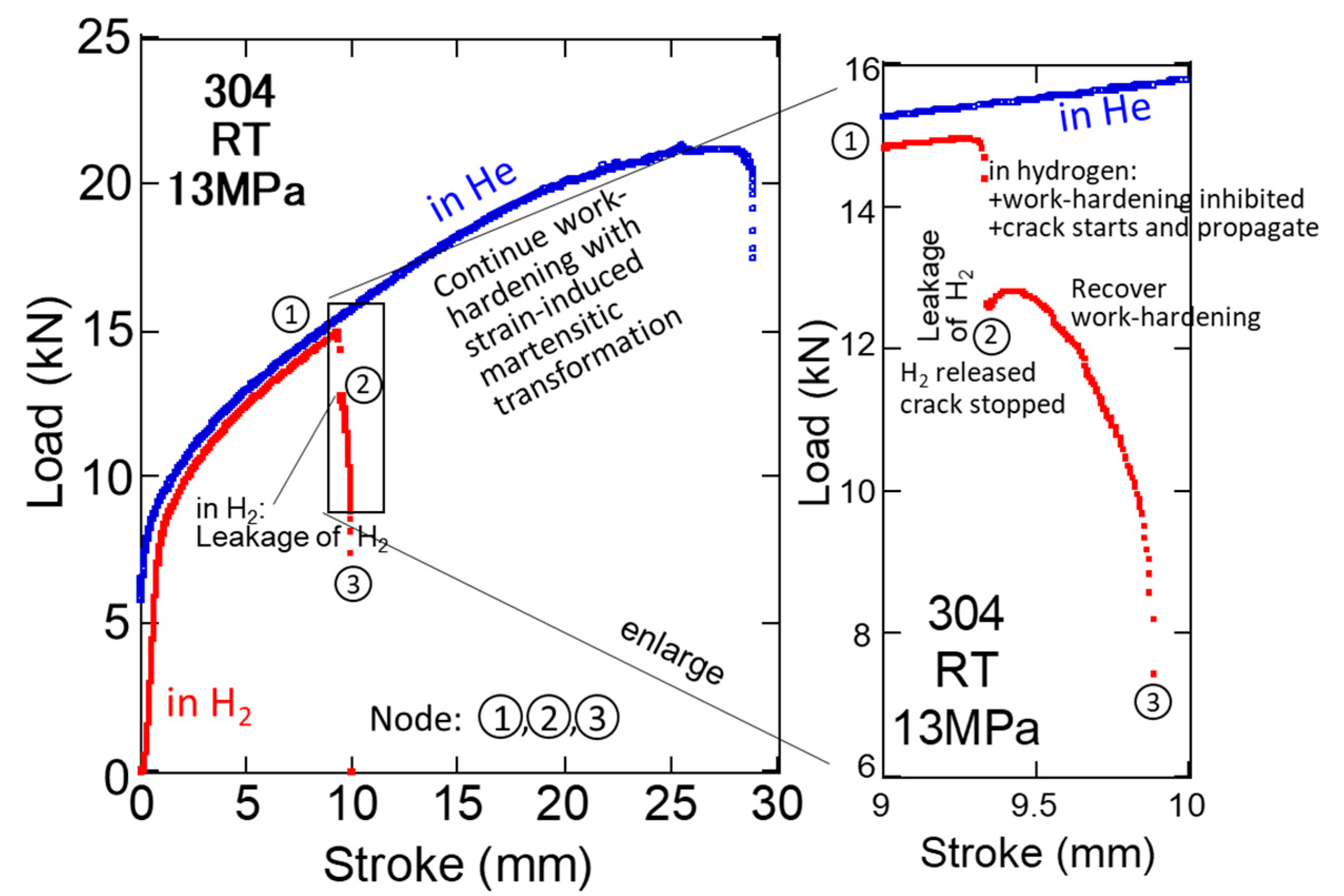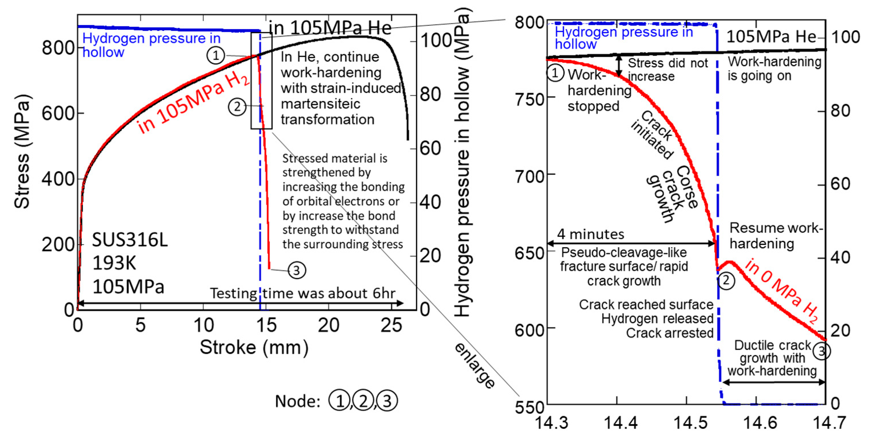 Figure 10, the stress increased after the pressure drop, and the slope of the drop was close to that in He, which indicated that the effect of hydrogen disappeared, and work hardening resumed. The fact that the rapid crack growth by H