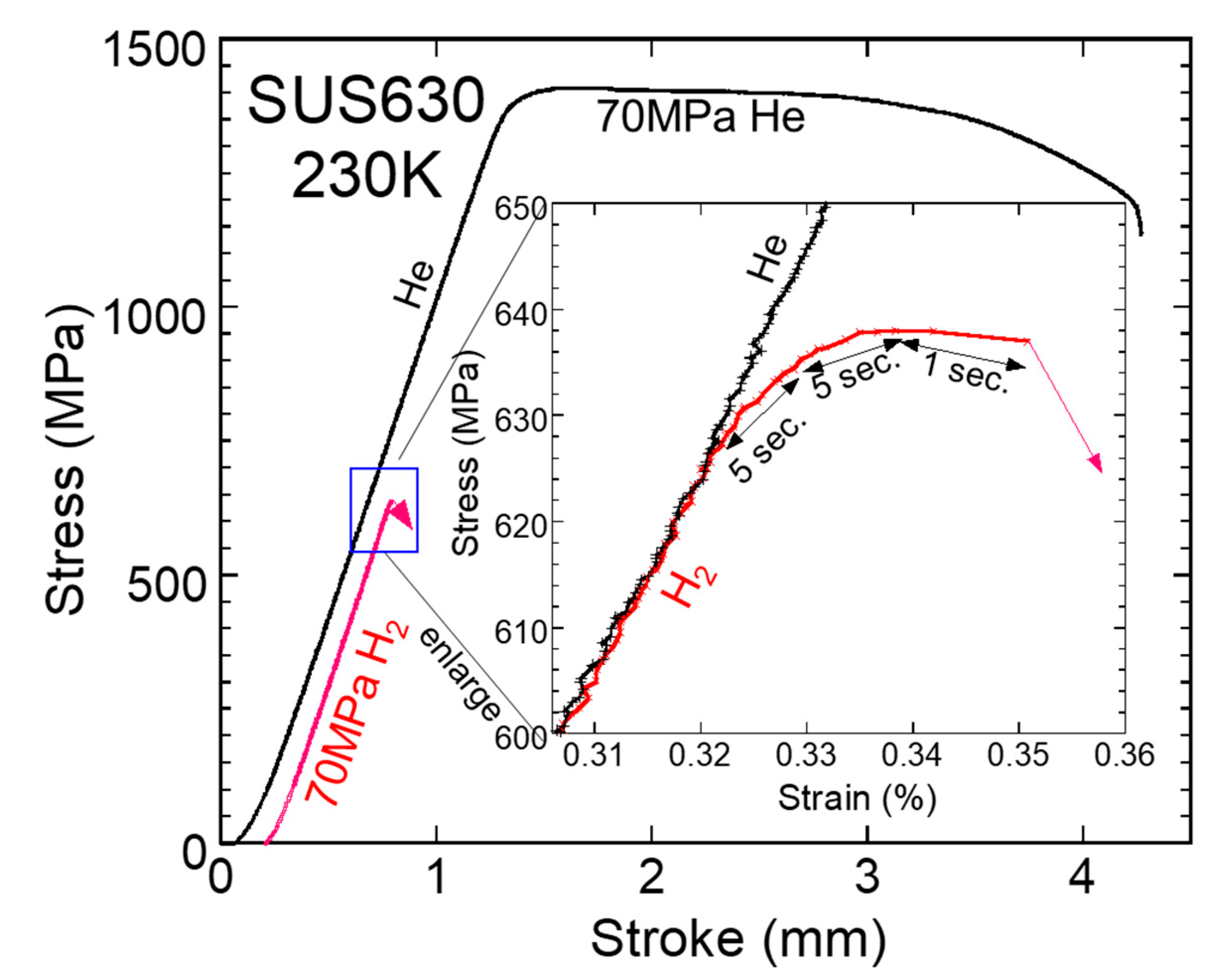 Figure 8, the specimen took several minutes to break after the crack was initiated, the elongation was more than 30%, and no cleavage occurred; thus, this is not a brittle fracture, although the obtained strength and elongation are lower than those in He. Even in the case of SUS630, as shown in