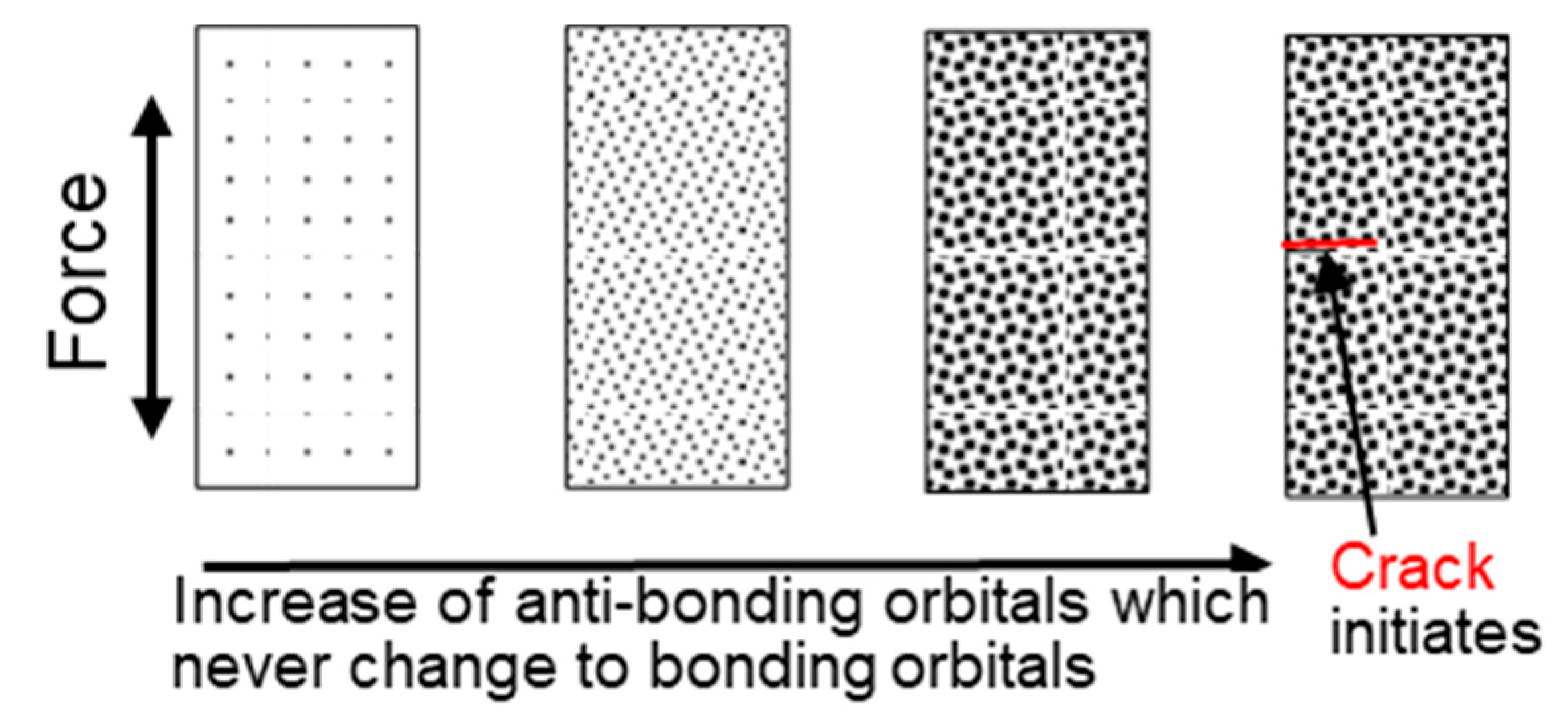 When a certain number of the antibonding orbitals (corresponding to “vacancies” in conventional theory) accumulate and the bonding orbitals that increase strength disappear, the material can no longer sufficiently increase its strength against external forces, and fatigue cracks initiate, propagating planarly owing to the lack of surrounding bonding orbitals, as shown in