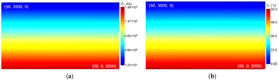 Figure 2. Initial reservoir pressure field and temperature field on the X = 50 m slice plane: (a) reservoir pressure PR; (b) reservoir temperature TR.