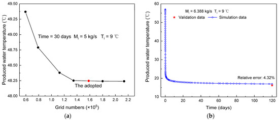 To accurately simulate the evolution of the temperature field around the wellbore, the grid size was refined from the model boundary to the wellbore. As can be seen from Figure 3a, the produced water temperature stabilized when the grid was encrypted to 134,504. Ultimately, the model was divided into 23, 91, and 86 grids in X, Y, and Z-directions, respectively, totaling 179,998 grids. Model validation was conducted using the vertical well closed-loop geothermal system, as shown in Figure 3b. Since the influence of low thermal conductivity cement on heat transfer was not considered, our simulation result was slightly higher than that in Ref. [41]. However, the relative error is less than 5%, demonstrating the reliability of our simulation.