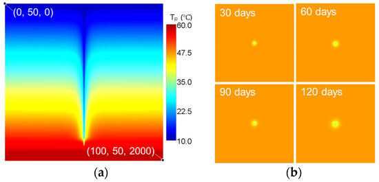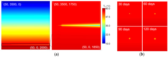 Figure 4. Evolution of the temperature field of the vertical well system: (a) on the X = 50 m slice plane at 120 days; (b) on the Z = 1500 m slice plane at 30, 60, 90, and 120 days.