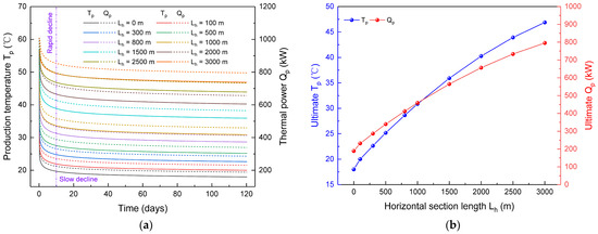 1. Horizontal well closed-loop geothermal systems demonstrate tantalizing heat extraction potential because the increase in horizontal section length allows for a greater heat exchange area. Specifically, when the horizontal section length increased from 0 to 3000 m, the ultimate production temperature and ultimate thermal power increased from 17.98 °C and 188 kW to 46.87 °C and 795 kW, respectively.
