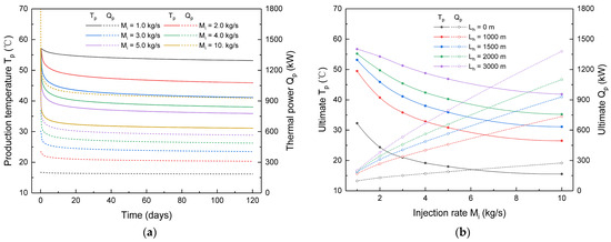 Figure 7 shows the Tp and Qp for various Mi values. As can be seen, Tp decreases as Mi increases, while Qp presents an opposite trend. Specifically, when Mi increased from 1 to 10 kg/s, the ultimate TP at Lh of 1500 m decreased from 25.34 to 35.67 °C, and the ultimate Qp increased from 185 to 929 kW. This indicates that increasing Mi can significantly improve heat extraction efficiency, but simultaneously decreases Tp. Given that insufficient Tp is unfavorable for real-world applications (such as building heating), there should exist an upper limit value for Mi. Furthermore, the increase rate of Qp gradually decreases with increasing Mi, while Tp increases approximately linearly. When Lh increased from 0 to 3000 m, the ultimate Tp at Mi values of 1, 2, 3, 4, 5, and 10 kg/s increased by 75%, 122%, 144%, 154%, 160%, and 169%, respectively, and the ultimate Qp increased by 104%, 194%, 251%, 291%, 321%, and 402%, respectively. This demonstrates that increasing Lh effectively suppresses the reduction in Tp caused by the increase in Mi, thereby further improving heat extraction efficiency. Consequently, compared to vertical well systems, the upper limit value of Mi in horizontal well systems is significantly improved.