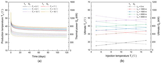 Figure 8 exhibits the TP and Qp for various Ti values. As can be seen, improving Ti favors gaining a higher Tp value. Specifically, when Ti increased from 5 to 15 °C, the ultimate TP at Lh of 1500 m increased from 34.34 to 38.22 °C, and the ultimate Qp decreased from 616 to 487 kW. That is, an improvement of 10 °C in Ti results in an improvement of only 3.88 °C in Tp. This demonstrates that improving Tp by increasing Ti is not satisfactory, as it weakens the heat extraction from the formation. In addition, the variation in both ultimate Tp and ultimate Qp at various Lh values with Ti is approximately linear. Specifically, when Ti rises from 5 to 15 °C, the increase in ultimate Tp at Lh of 0, 1000, 1500, 2000, and 3000 m is 6.66, 4.71, 3.88, 3.17, and 2.07 °C, respectively, and the decrease in ultimate Qp is 70, 111, 129, 143, and 167 kW, respectively. This indicates that as Lh increases, the contribution of improving Ti to heat extraction becomes increasingly insignificant. As a result, increasing Ti is not an ideal way to improve heat extraction capacity.