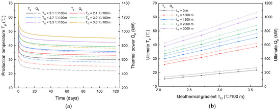 Figure 9 shows the Tp and Qp for various TG values. It can be observed that both Tp and Qp increase with increasing TG as higher formation temperatures are more conducive to heating the injected cold water. Specifically, the ultimate Tp and ultimate Qp at Lh of 1500 m increased from 30.03 °C and 441 kW to 45.34 °C and 763 kW as TG increased from 2.1 to 3.6 °C/100 m. That is, an increase in formation temperature of 27 °C at 1800 m resulted in increases of 15.31 °C and 332 kW in Tp and Qp, respectively. This illustrates that the impact of TG on heat extraction efficiency is quite noticeable. Furthermore, the ultimate Tp and ultimate Qp increase approximately linearly with increasing TG. When TG increases from 2.1 to 3.6 °C/100 m, the enhancement in ultimate Tp and ultimate Qp at Lh of 0 m are 6.40 °C and 134 kW, while they are 12.73, 15.31, 17.44, and 20.86 °C and 267, 322, 366, and 483 kW at Lh of 1000, 1500, 2000, and 3000 m. This reveals that as Lh increases, the improvement in heat extraction capacity under a greater TG value becomes more substantial due to the more efficient heat exchange occurring there.