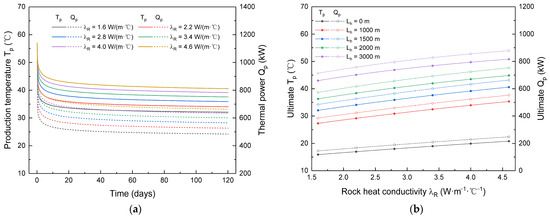 Figure 10 shows the Tp and Qp for various λR values. It can be identified that as λR increases, the initial Tp and Qp decay rates gradually decrease, resulting in a more considerable heat extraction efficiency. Specifically, the ultimate Tp and ultimate Qp increased from 15.88 °C and 144 kW to 20.80 °C and 247 kW at Lh of 1500 m as λR increased from 1.6 to 4.6 W/(m·°C). The mechanism is that a greater λR value is more conducive to the transmission of heat from the formation to the wellbore. Furthermore, the ultimate Tp and ultimate Qp increase approximately linearly as λR increases. Specifically, when λR increases from 1.6 to 4.6 W/(m·°C), the enhancement in ultimate Tp and ultimate Qp at Lh of 0 m are 4.92 °C and 103 kW, while they are 7.86–8.58 °C and 165–180 kW at Lh of 1000–3000 m. This reveals that a greater λR value is more conducive to heat extraction in horizontal well systems, attributed to the more considerable heat exchange area. Furthermore, in the current simulation, there is an optimal Lh value of 2000 m, where the improvement in heat extraction efficiency is most pronounced by increasing λR.