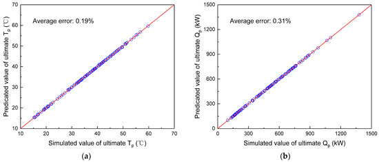 Figure 11 shows the prediction error of the trained XGBoost models. It can be observed that the prediction values of ultimate Qp and ultimate Tp based on the trained XGBoost models are basically consistent with the simulated values, with prediction errors of 0.19% and 0.31%, respectively, indicating prediction accuracies of over 99.6%, which proves the reliability of the trained XGBoost models.
