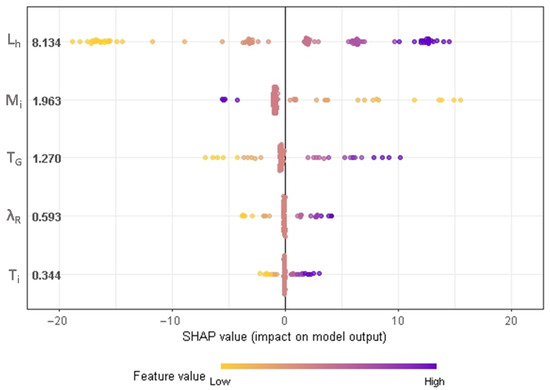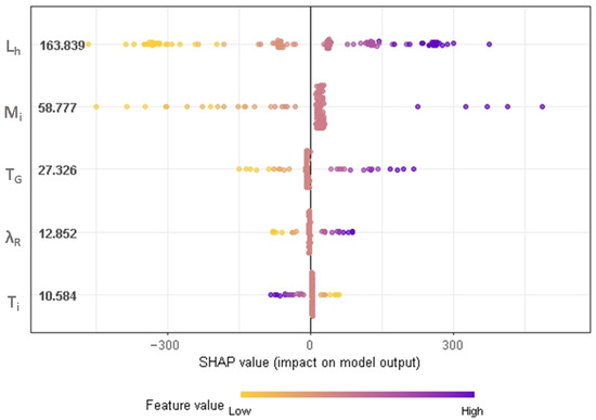 Figure 12 shows the SHAP value of each influencing factor on the ultimate Tp. The feature values of Lh, Ti, TG, and λR increase as the SHAP value increases, indicating they have a positive impact, while Mi presents an opposite trend. Based on the mean SHAP values, the importance of each influencing factor to ultimate Tp is ranked in descending order as follows: Lh (8.134), Mi (1.963), TG (1.270), λR (0.593), and Ti (0.334).