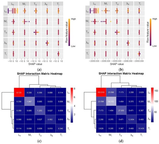 Figure 14 illustrates the interaction effects among the parameters. The shapviz package in R was used to visualize interaction effects, as shown in Figure 14a,b. Main effects are displayed along the diagonal, while interaction effects are indicated on either side of the diagonal. The greater the dispersion of points, the stronger the interaction between parameters. To quantify interaction effects, interaction matrices were further plotted as shown in Figure 14c,d. It can be observed that for ultimate Tp, interaction strengths between parameters are all below 0.36 and relatively weak, indicating that Tp primarily depends on the main effects of Lh and Mi. For Qp, a significant interaction exists between Lh and Mi, with a maximum interaction strength of 23.598. Interactions among other parameters are relatively weak. Therefore, Qp is primarily determined by the main effects of Lh and Mi, as well as their interaction.