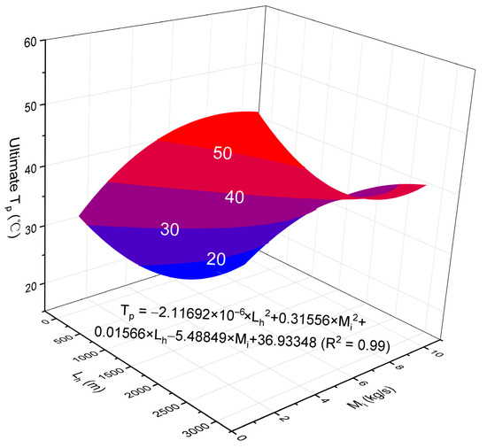 The above analysis indicates that Lh and Mi are the dominant factors influencing heat extraction efficiency. Based on this, we optimized the horizontal well closed-loop geothermal system for the Xiong’an New Area geothermal field. Taking the operational conditions of the vertical well closed-loop geothermal system in Ref. [41] as a typical case (Mi = 23 m3/h, Ti = 9 °C), the relationship between ultimate Tp with Mi and Lh is presented in Figure 15. The Tp and Qp of the vertical well closed-loop geothermal system were reported as 16.2 °C and 192 kW, respectively, far below the minimum acceptable temperature of 40 °C for winter heating. However, when the Lh reaches 2375 m in the horizontal well closed-loop geothermal system, the Tp and Qp can be maintained above 40 °C and 831 kW, respectively, demonstrating tantalizing application potential.