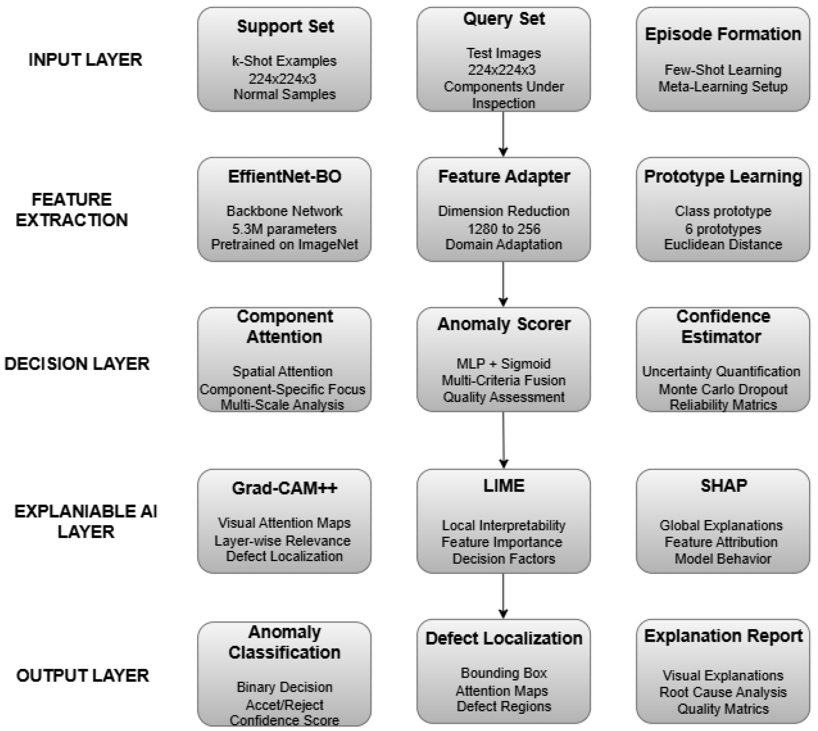 This study builds on these advances by presenting a practical, explainable few-shot anomaly detection framework tailored to automotive quality control (QC). The system adapts to new defect types from as few as examples via prototype learning, sustains real-time throughput (≈18.2 ms per image, ∼60 components/min) with a lightweight 5.8M-parameter model, and produces component-level explanations with severity-based actions suitable for manufacturing execution system (MES) integration (e.g., OPC-UA, Modbus, EtherNet/IP). The framework specifically addresses four persistent gaps: (i) scarce labeled data and cross-domain drift, mitigated by prototypes and component analyzers; (ii) limited interpretability, enhanced through Grad-CAM++, LIME, and SHAP with a calibrated 0.7 decision threshold; (iii) deployment friction, reduced through a compact memory footprint (≈1.8 GB); and (iv) weak cross-domain evidence, validated through gear versus engine-wiring experiments with only a 0.63% accuracy degradation.