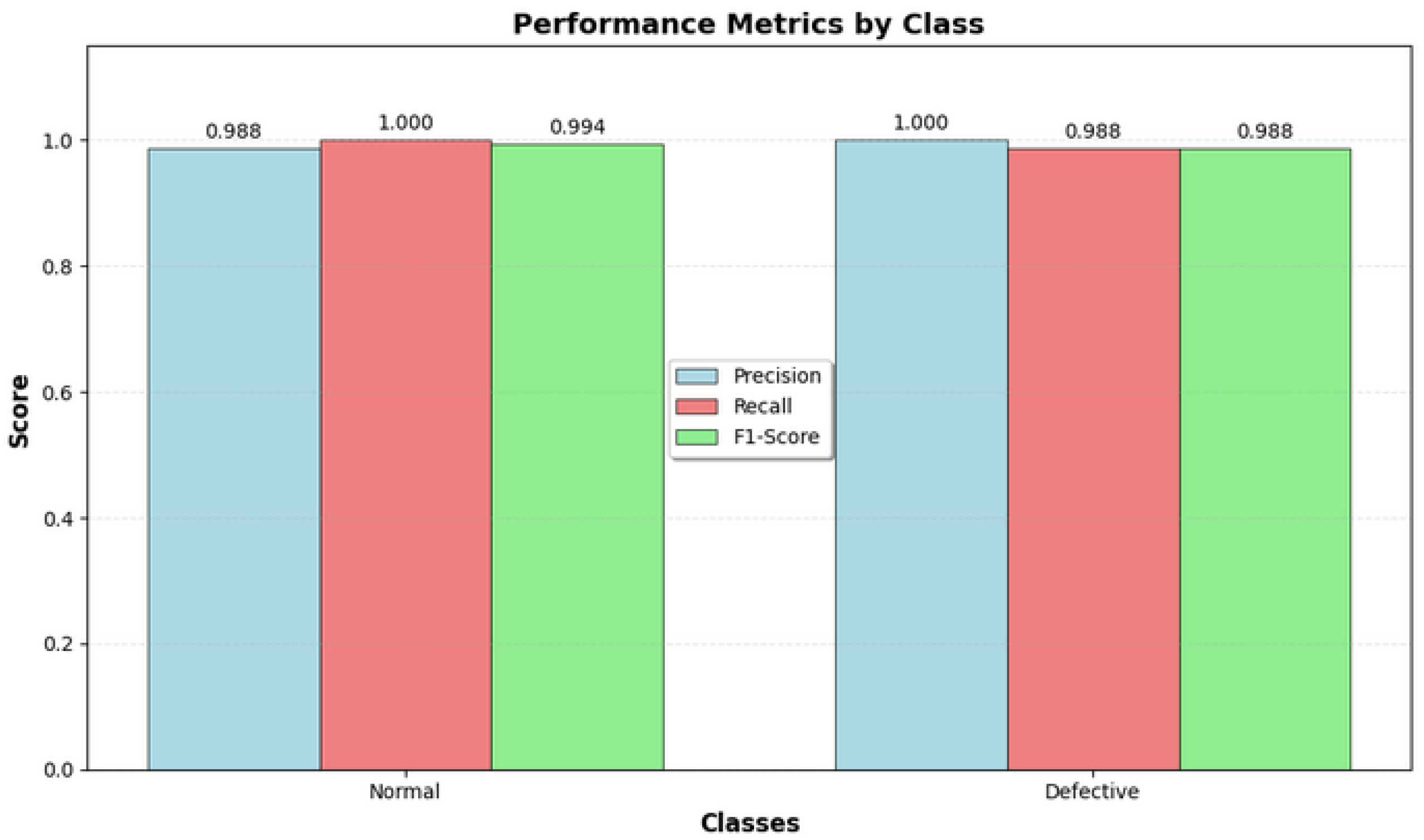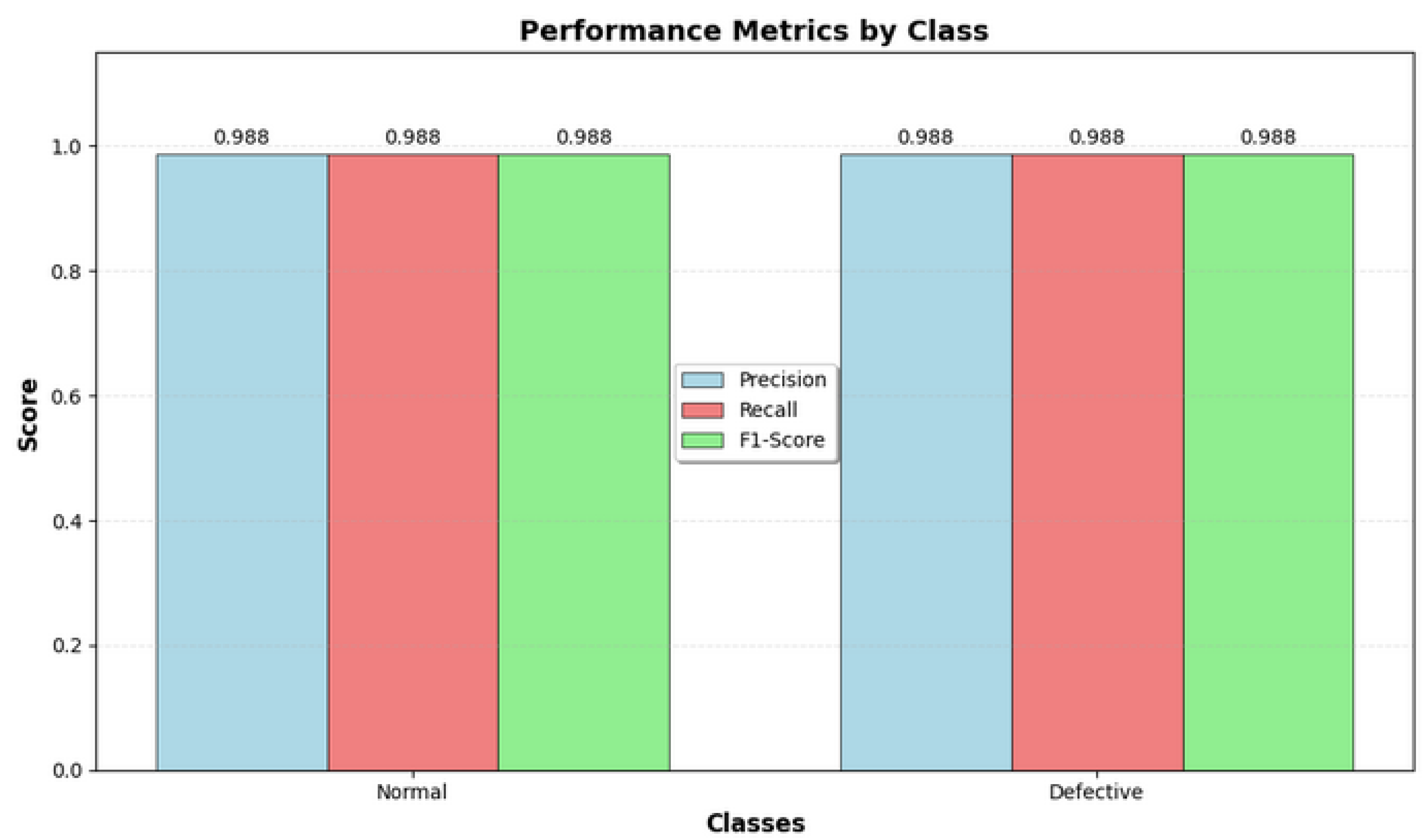 Figure 7 shows the manufacturing inspection performance analysis, including a ROC-AUC evaluation, precision–recall optimization, and classification metrics. The consistency in performance across all evaluation criteria validates the system’s manufacturing readiness.