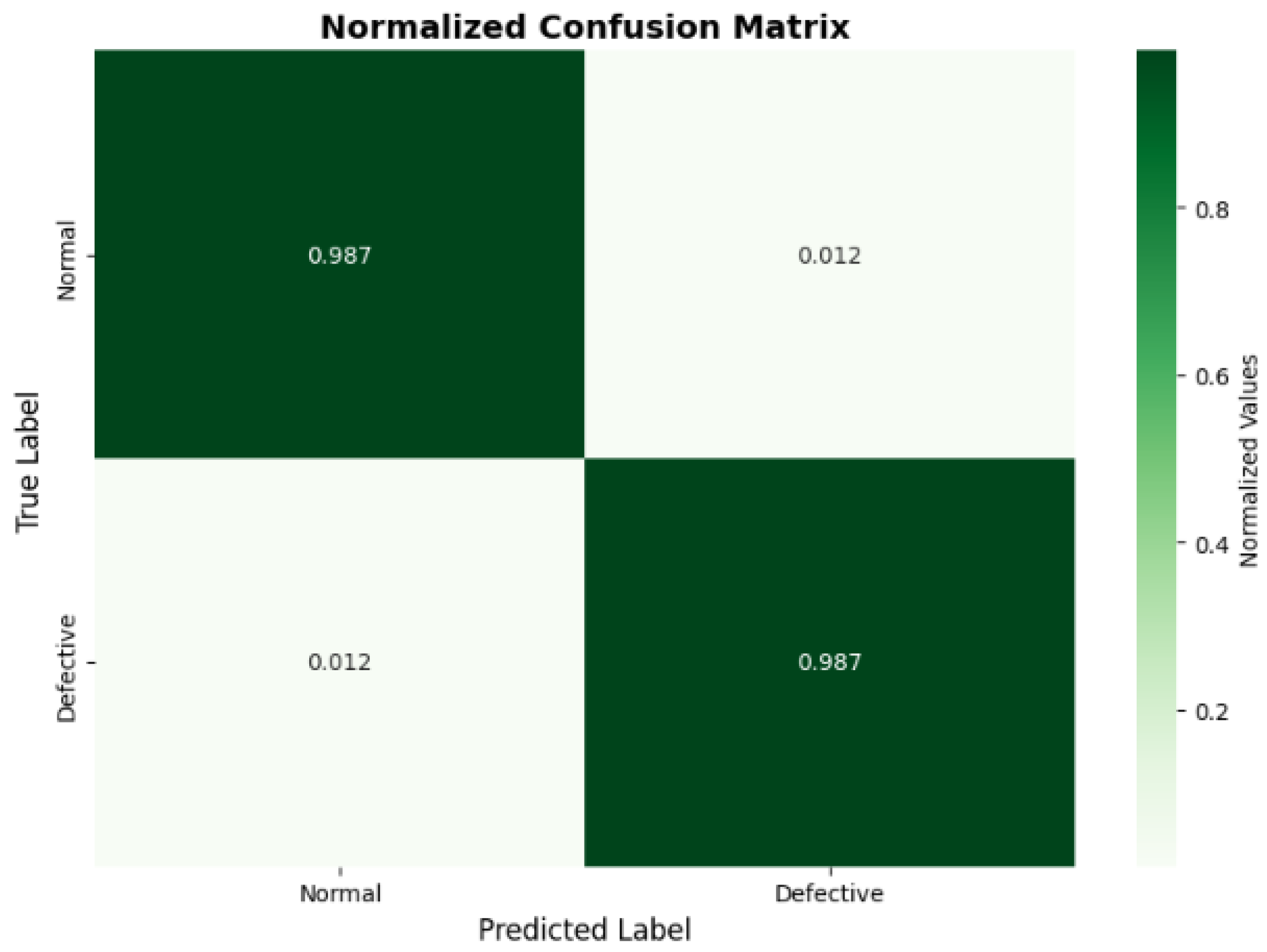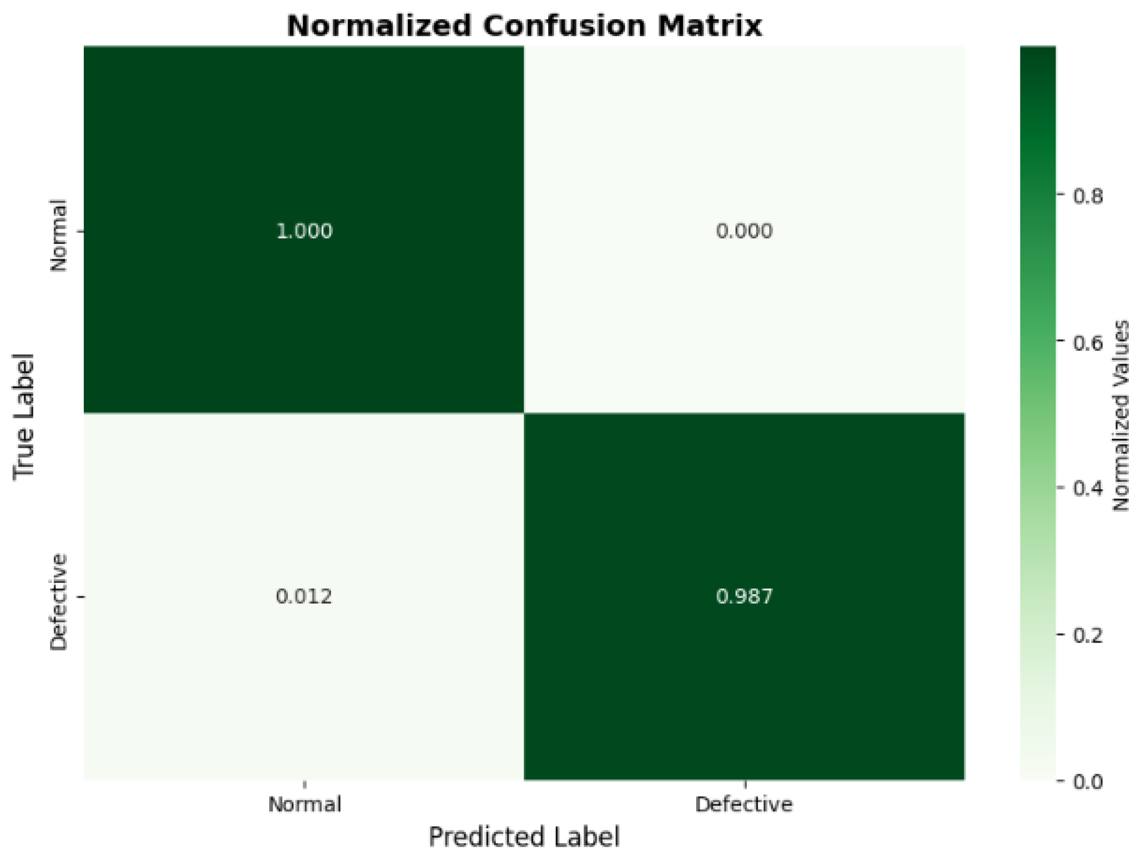 Figure 3 shows the confusion matrix analysis with perfect precision for defective component detection.