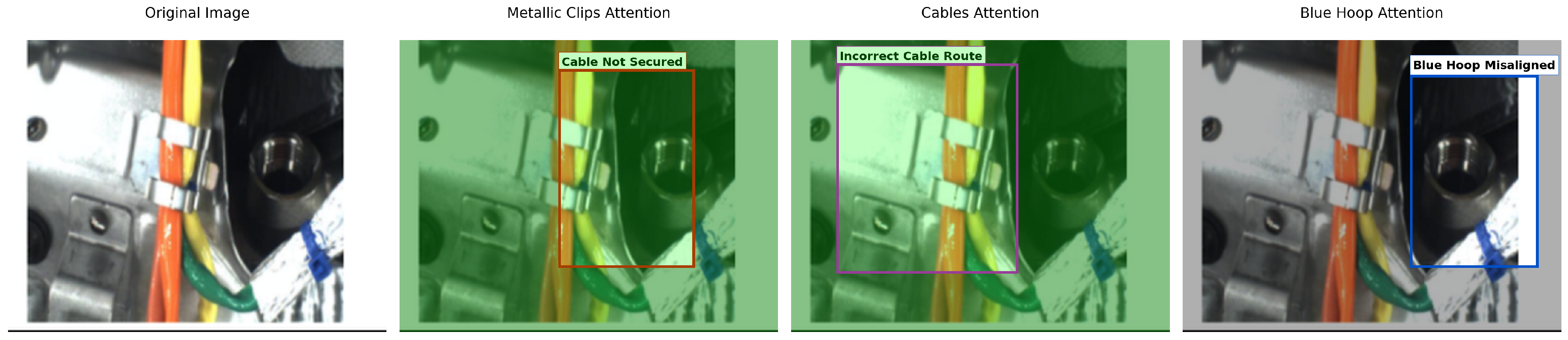 Figure 4 demonstrates the explainable AI capabilities through component-specific attention visualizations, highlighting the system’s ability to focus on critical assembly regions, including metallic clips, cable routing, and blue hoop positioning.