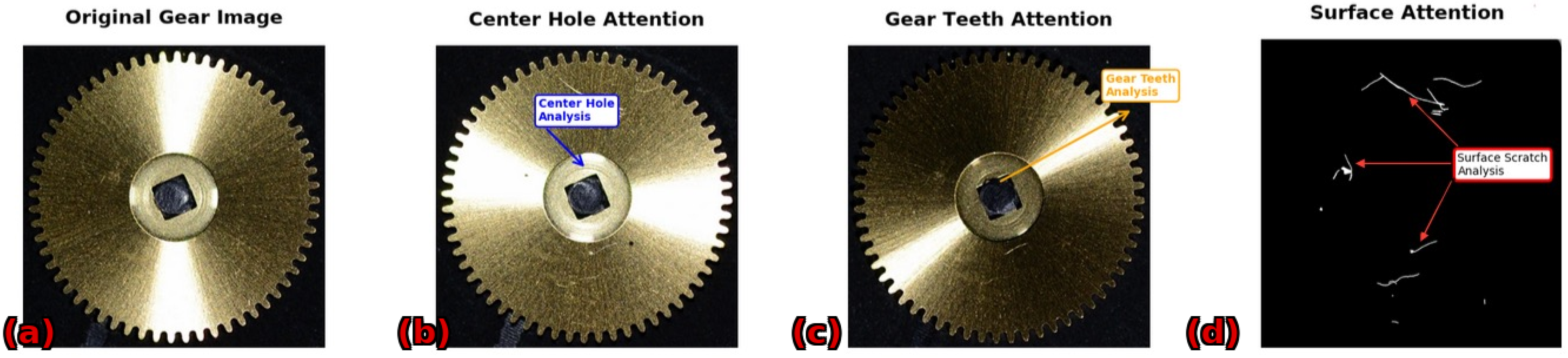 To address the diverse requirements of automotive quality control, specialized component analyzers are developed. For engine wiring assemblies, sub-modules evaluate cable fastening integrity, verify hoop positioning for alignment accuracy, and assess clip engagement reliability. For precision gears, analyzers evaluate the quality of the surface finish, detect contamination and foreign materials, and verify the accuracy of the dimensions against the tolerance specifications. These targeted analyzers provide domain-specific insights that general-purpose models cannot capture.