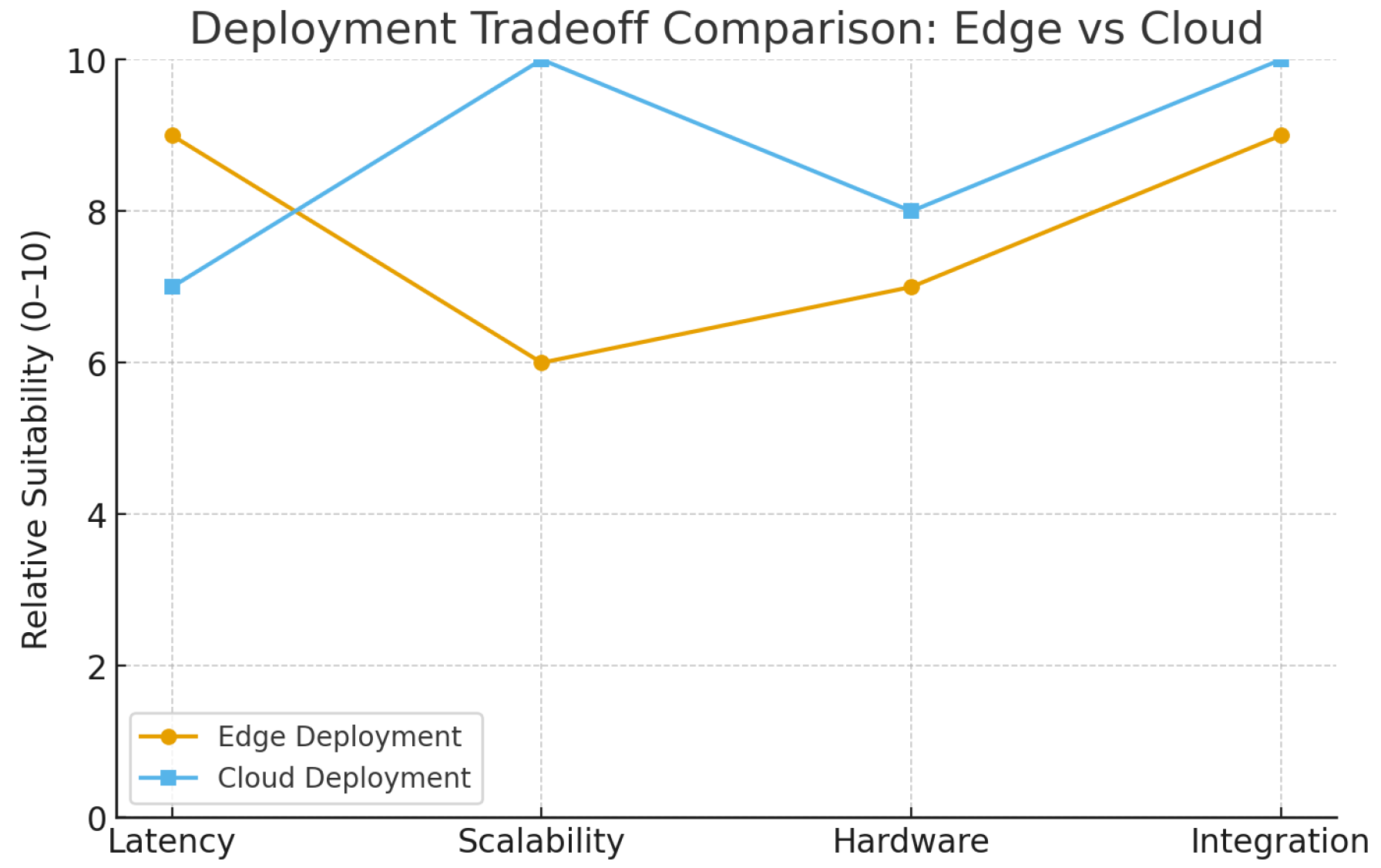 Edge deployment excels in latency and network independence, while cloud deployment provides superior scalability and update flexibility (