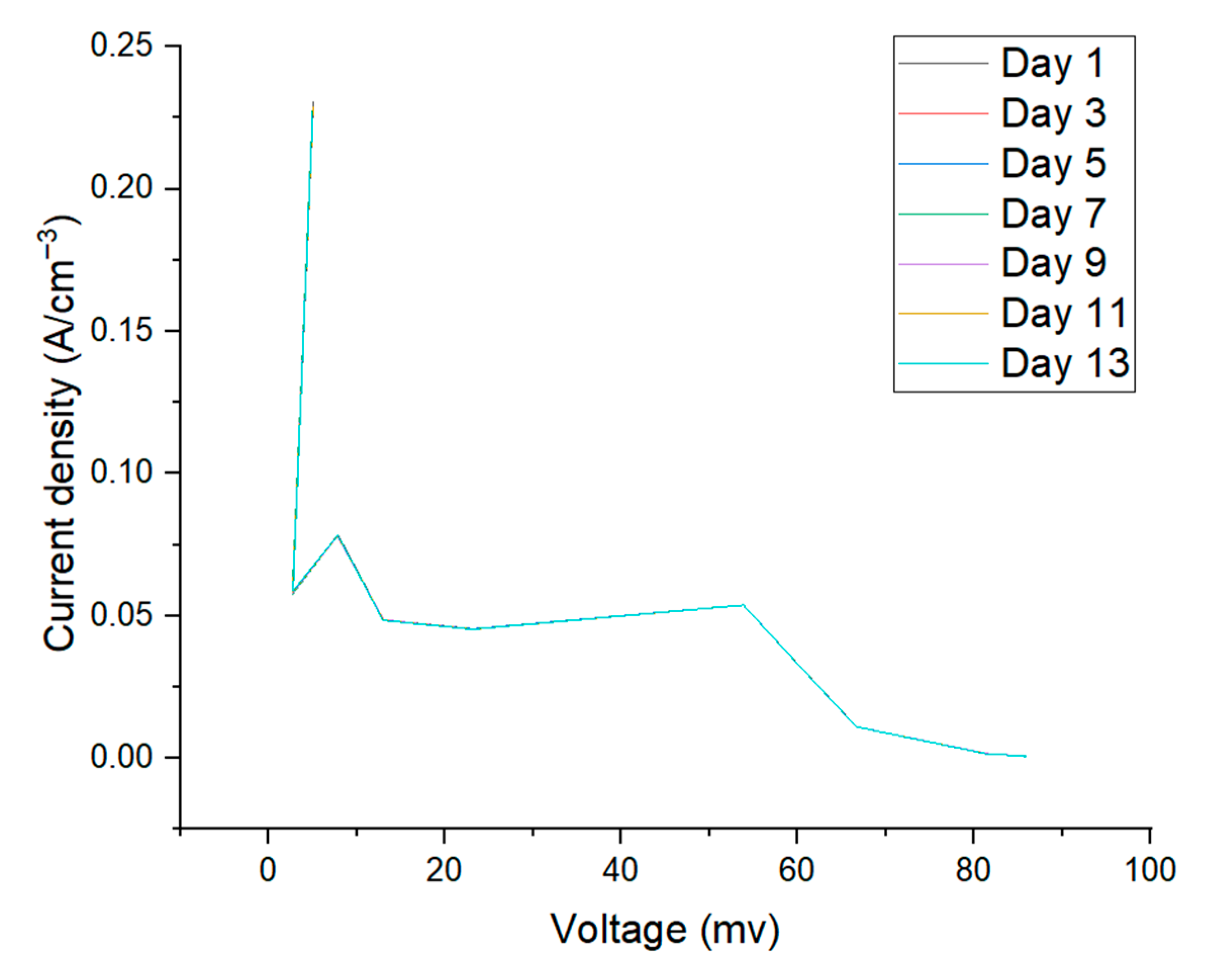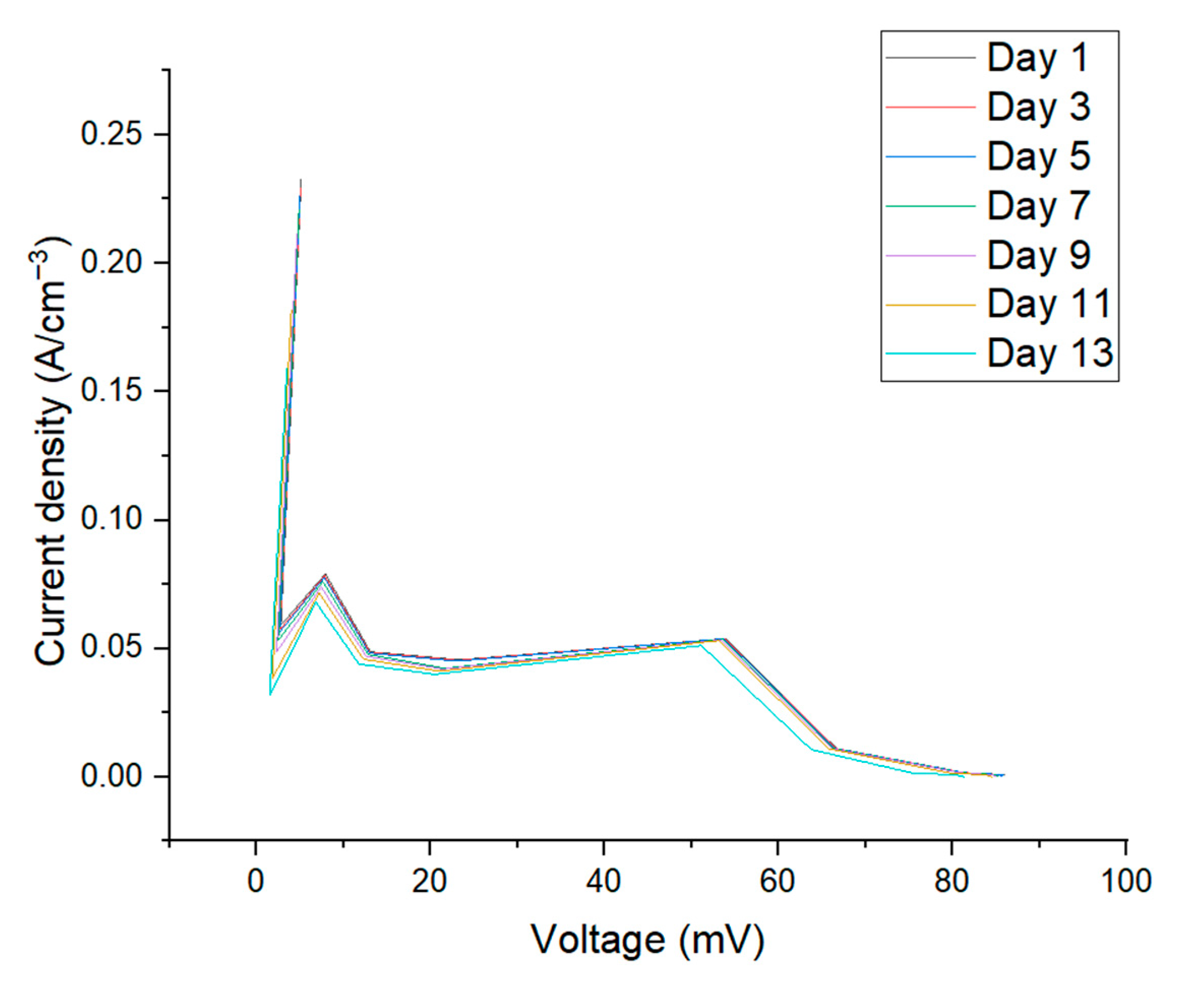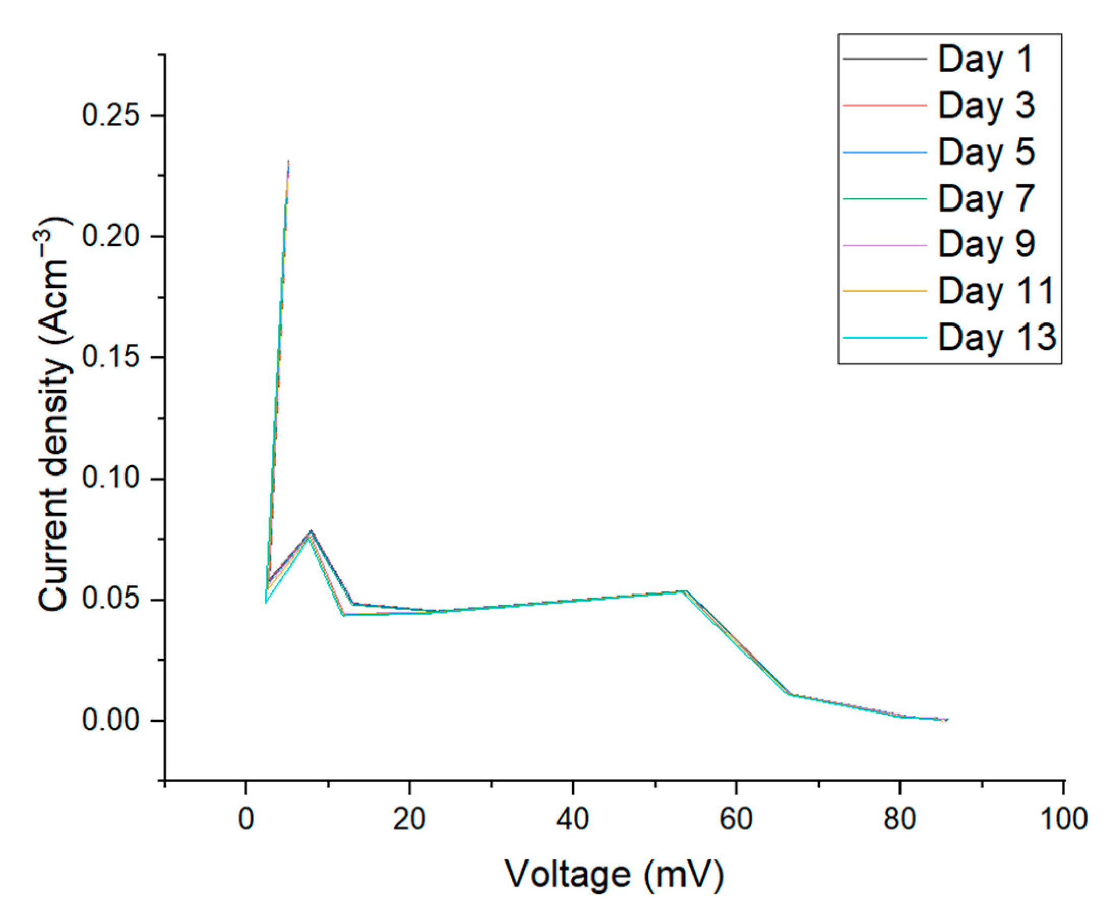 3.2. Electrochemical Characterization: Current vs. Voltage Plot