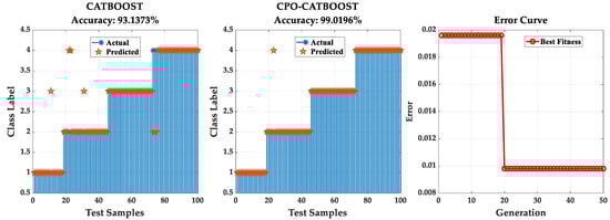 Figure 6 presents the confusion matrix for fault recognition in the test set, comparing VMD-24D MFCC under standard CatBoost and CPO-optimised CatBoost. It clearly demonstrates that CPO-CatBoost achieves a fault recognition accuracy of 99.0169%, surpassing standard CatBoost by approximately 6%. For normal conditions with transformer core loosening, the recognition rate reached 100%, exceeding the standard by 5.8824%. Under a 60% core loosening fault scenario, the recognition rate was 96.0784%, surpassing the standard by 7.4074%. Both methods achieved zero errors in the 80% fault scenario. For the 100% core loosening fault condition, the CPO-optimised CatBoost reduced the fault recognition error rate by 10.4573%, achieving 100% accuracy. The VMD-24D MFCC achieved near-perfect classification with the CPO-CatBoost classifier, demonstrating that the CPO-optimised algorithm significantly enhances classification accuracy. CPO optimisation effectively boosts the classification performance of the CatBoost algorithm.