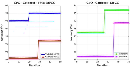 Experiments yielded fault recognition accuracies of 88.5448%, 85.7965%, and 83.9735% for VMD-39D MFCC, 24D MFCC, and 39D MFCC, respectively, under the standard CatBoost algorithm. As shown in Figure 5, this graph illustrates the convergence process over 50 iterations for four different methods under the CPO-CatBoost algorithm. In the VMD-denoised signals, VMD-24D MFCC improved its fault recognition accuracy from 98.0392% to 99.0196% within 19 iterations; VMD-39D MFCC started at only 93.2069% accuracy and reached 95.4823% after 29 iterations. Without denoising, the 24D MFCC fault recognition accuracy increased from 90.5517% to 93.4310% after 27 iterations. The 39D MFCC started at an initial accuracy of 87.4173% and only barely exceeded 90% after 36 iterations, reaching 91.7691%.