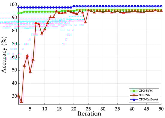 Figure 7 illustrates the fault recognition accuracy curves of the three algorithmic models on the training set. The SVM algorithm achieved a fault recognition accuracy of 76%. Observing the training process, the CPO-CatBoost algorithm demonstrated optimal learning capability, with its fault recognition accuracy exceeding 98% in the early iterations and remaining stable thereafter. After 19 iterations, it maintained a high accuracy of 99% with exceptional stability. The CPO-SVM algorithm’s fault recognition accuracy rapidly increased from 93% to 94% within the first 15 iterations. Subsequently, it rose from 95% to 96% and remained stable, demonstrating excellent fitting stability. The 3D-CNN algorithm exhibited low initial accuracy (25–30%). After approximately 12 iterations, fault recognition accuracy improved to 92–95%, ultimately stabilising near 95%. However, significant fluctuations occurred during training—for instance, accuracy dropped to 86% at the 24th iteration—reflecting the algorithm’s instability during training. Experimental results demonstrate that the CPO-CatBoost algorithm not only exhibits the fastest convergence speed and highest training accuracy but also delivers the most stable training process.