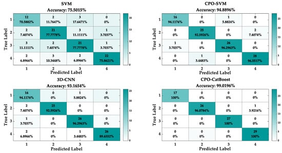Having established classification accuracy based on the VMD-24D MFCC and CPO-CatBoost models, we further conducted comparative analysis with mainstream algorithmic models in this field: First, the same dataset was processed using VMD-24D MFCC. The processed data were then input into traditional SVM [40], CPO-SVM [41] (a support vector machine based on the CPO optimisation algorithm), and 3D-CNN [42] (a three-dimensional convolutional neural network). The diagnostic results are presented in Figure 7, Figure 8 and Figure 9.