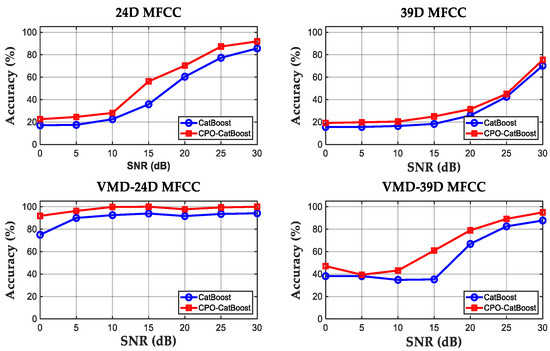 In Figure 10, without VMD denoising preprocessing, system performance is severely constrained, and traditional MFCC without VMD denoising is significantly impacted by noise. Under standard CatBoost and CPO optimization, 24D MFCC starts with extremely low fault recognition accuracy of 17.0833–22.5417% at 0 dB, gradually climbing to 85.6250–91.8750% at 30 dB. CPO optimization delivers approximately a 10% improvement in the medium-to-high SNR range. The 39D MFCC performed worst, achieving only 15.6583–19.1667% fault recognition accuracy at 0 dB and 70.2083–75.3750% at 30 dB. This indicates that without effective denoising preprocessing, noise severely interferes with MFCC’s feature extraction, drastically reducing feature discriminative power. Even the advanced CatBoost classifier, optimized by the CPO algorithm, struggles to accurately identify fault modes from noise-corrupted features.
