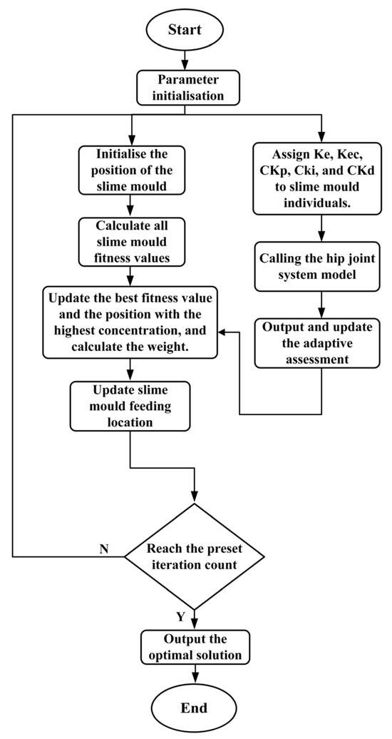 This study explored the optimization of parameter tuning for a fuzzy PID controller, utilizing the slime mould algorithm (SMA) within the MATLAB simulation environment. In accordance with the national standard GB/T 10000-2023 [25], titled “Human Body Dimensions for Adults in China”, this research established a biomechanical model to represent hip joint movement within the lower limbs. The specific parameters pertaining to the exoskeleton were defined as follows: the mass of the thigh was designated at 0.143 kg, the length of the lower limb link was set at 0.46 m, and the rotational inertia was calculated to be 0.01 kg·m2. Regarding the configuration of the simulation environment, a fixed-step solver was employed for numerical computations, with a step size established at 0.01 s to ensure computational accuracy. Gravitational acceleration was consistently standardized at 9.81 m/s2 to maintain uniformity across simulations. The population size for the slime mould algorithm was configured to 30, with a solution dimension of 5. Correspondingly, the population size for the particles in the particle swarm optimization (PSO) algorithm was also set to 30, maintaining the same solution dimension of 5. Subsequently, the joint simulation was executed in accordance with the flowchart presented in Figure 5.