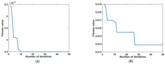 (a) Iterative optimization fitness curve of the slime mould algorithm (SMA). (b) Iterative optimization fitness curve of the particle swarm optimization (PSO) algorithm.