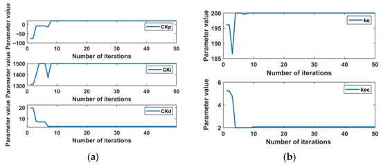 As illustrated in Figure 7, the optimal parameters determined through the slime mould algorithm (SMA) were as follows: Ke = 200, Kec = 2.0159, CKp = 10, CKi = 1500, and CKd = 0.3702.