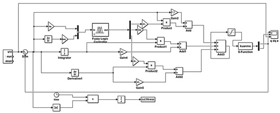 To assess the adaptive control performance of the hybrid SMA-fuzzy PID controller across multi-terrain environments, we performed simulation comparisons of hip joint trajectory tracking for lower-limb exoskeletons in three representative scenarios: flat ground walking, slope walking, and stair climbing. The simulations encompassed various control methodologies including PID control, fuzzy PID control, PSO-fuzzy PID control, and the hybrid SMA-fuzzy PID controller. Drawing upon the biomechanical characteristics of lower limb movement, a sine curve was selected as the reference model for the desired trajectory due to its capacity to effectively replicate the periodic characteristics of hip joint movement across varying terrains through parameter modulation. For flat ground walking, a low-frequency, high-stability sine curve was employed, which exhibited a smooth waveform devoid of pronounced fluctuations, thereby reflecting the uniformity and stability of hip joint movement in this scenario. In contrast, slope walking was modeled with a gradually varying sinusoidal signal, simulating the progressive alterations in joint angle. Stair climbing was represented by a step-modulated sinusoidal periodic signal, illustrating the phased impact characteristics associated with leg-lifting movements. The control system for the lower-limb exoskeleton hip joint, developed for the experiment, is illustrated in Figure 8.