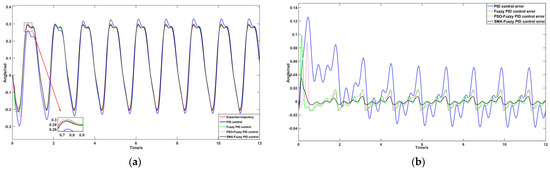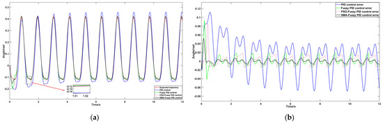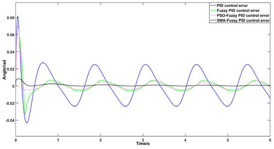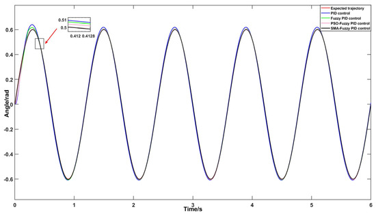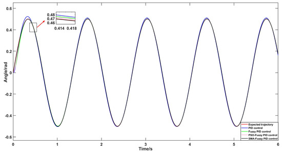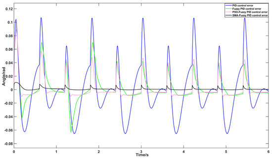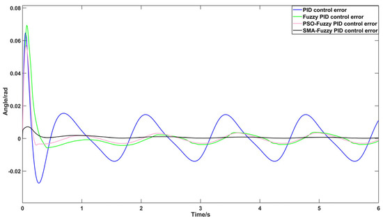 As illustrated in Figure 10, the simulation results of the tracking error curves for each controller revealed that the classical PID controller exhibited the most substantial steady-state error fluctuation range, spanning from −0.01399 rad to 0.01541 rad. This was followed by the fuzzy PID controller, with a range of −0.003682 rad to 0.003603 rad. In contrast, the PSO-fuzzy PID controller demonstrated the smallest fluctuation range, from −0.002963 rad to 0.003421 rad. Notably, the SMA-fuzzy PID controller exhibited markedly superior steady-state tracking accuracy compared with the other control methods.