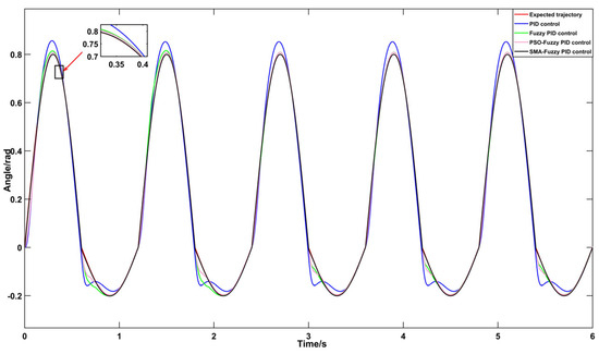 As illustrated in the trajectory tracking curve presented in Figure 9, the output trajectories generated by all controllers displayed periodic fluctuations that aligned with the gait cycle. Regarding tracking accuracy, the SMA-fuzzy PID control demonstrated superior performance, achieving the highest degree of conformity between its trajectory and the desired trajectory. Notably, it exhibited minimal deviation at critical phase points such as peaks and troughs. The PSO-fuzzy PID control came in a close second, whereas traditional PID and fuzzy PID controls showed relatively larger deviations. In terms of convergence speed, the SMA-fuzzy PID control again took the lead, reaching a stable tracking state in merely 0.362 s. This was significantly quicker than the times recorded for PSO-fuzzy PID control (0.418 s), traditional PID control (0.477 s), and fuzzy PID control (0.612 s), thereby underscoring its superior dynamic response characteristics.