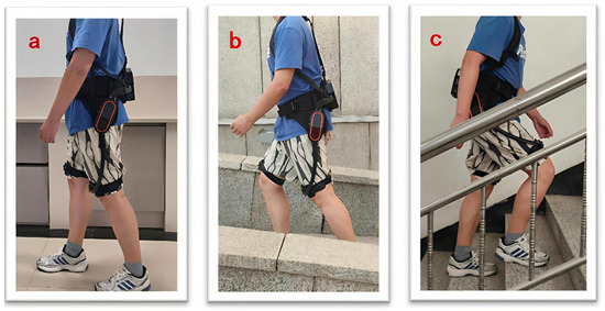 Data collection process for test subjects: (a) flat ground, (b) slope, and (c) stairs.