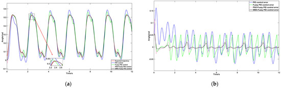 Figure 11 presents a comparative analysis of the hip joint trajectory tracking performance across four distinct control strategies in a slope walking scenario. The results indicate that all four controllers are capable of tracking the target trajectory; however, the hybrid SMA-fuzzy PID control demonstrated a markedly superior alignment with the desired trajectory, distinguished by the minimal tracking error and the highest tracking accuracy among the tested methods. Analyzing the temporal dimension of trajectory convergence to stable tracking, the times recorded for achieving stable tracking with PID, fuzzy PID, PSO-fuzzy PID, and SMA-fuzzy PID control were 0.441 s, 0.447 s, 0.438 s, and 0.384 s, respectively. Clearly, among the four control strategies, the SMA-fuzzy PID control method exhibited the fastest convergence of the hip joint motion trajectory, effectively achieving stable tracking of the desired trajectory with remarkable dynamic response and rapid convergence speed.