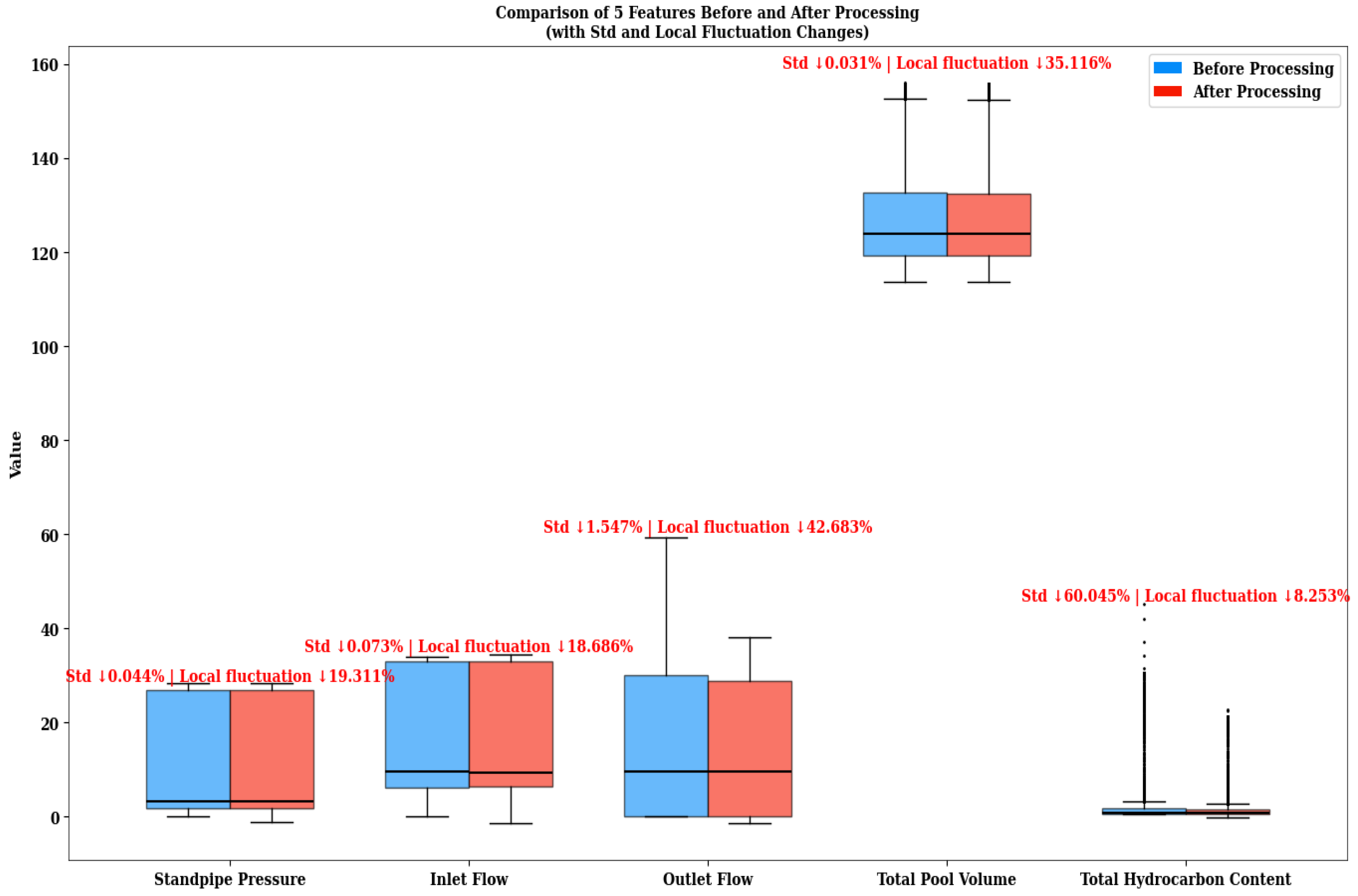 A comparative analysis of data characteristics reveals the following: First, during the outlier detection phase, the 3σ criterion was used to identify and eliminate statistically significant extreme points, effectively reducing the impact of noise on overall volatility indicators. For example, the standard deviation of the “total hydrocarbon” variable decreased by 60.04% after cleaning, significantly improving its volatility structure. This indicates that the original data contained numerous outliers that deviated from the mean, negatively impacting data stability. Second, during the data smoothing phase, a Savitzky–Golay filter was introduced, achieving a balance between trend preservation and noise suppression through local polynomial fitting, further improving data quality. After cleaning, the local fluctuation amplitudes of the “outlet flow rate” and “total pool volume” variables decreased by 42.68% and 35.12%, respectively. This demonstrates that this method effectively eliminates short-term, strong disturbance signals and improves the modelability and analytical robustness of time series data.