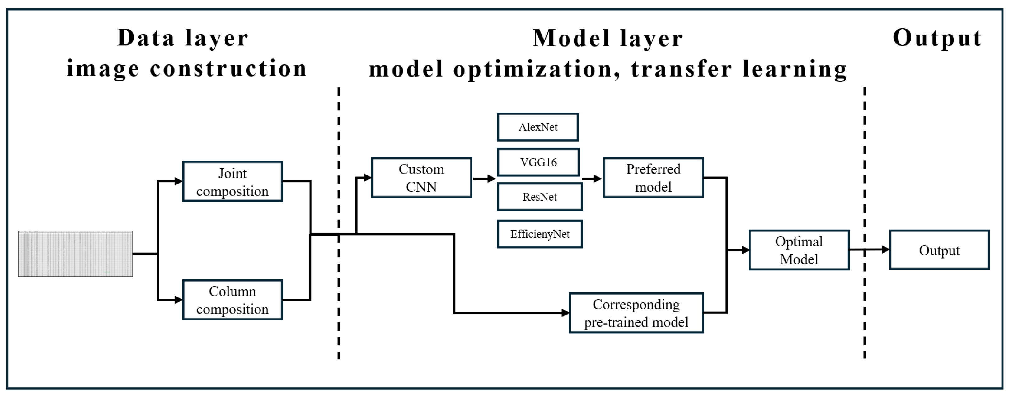 To accurately identify multivariate conditions in imaged mud logging data, this study constructed a CNN-based classification model system, encompassing two technical approaches: custom structure construction and transfer learning integration. A standardized input strategy was employed to explore the model’s performance under different image composition methods, as shown in