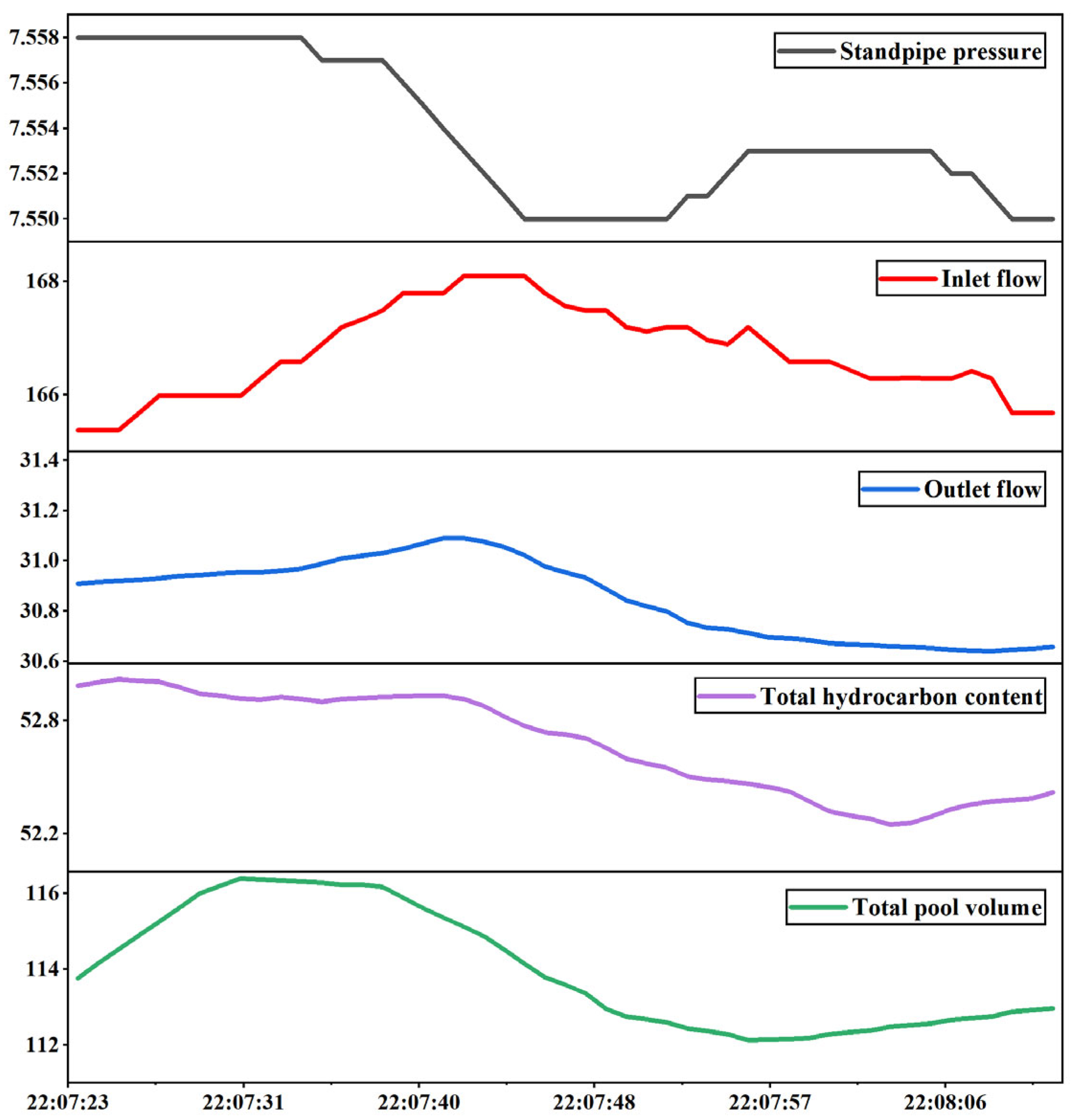 The total pool volume can comprehensively reflect the changes in the total amount of drilling fluid. Especially under gas invasion conditions, the pool volume usually increases rapidly due to the gas expansion effect. This parameter has good signal sensitivity for various kick types and is therefore introduced as an important supplementary feature.