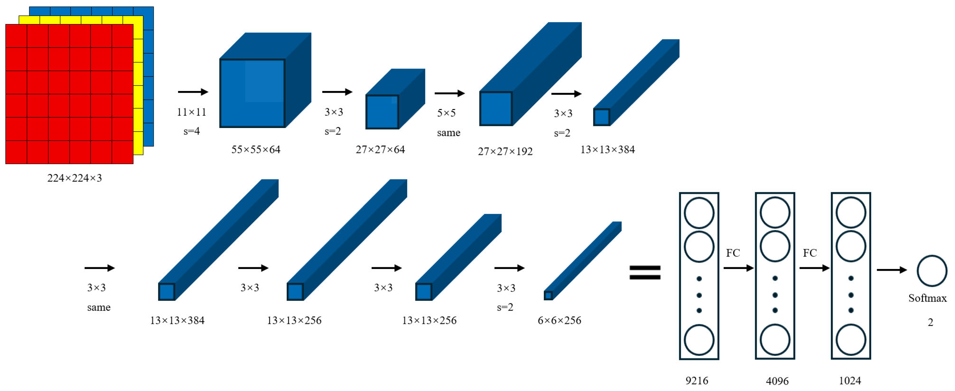50] is a landmark convolutional neural network in the field of deep learning. By introducing the ReLU activation function, local response normalization (LRN), and large receptive field convolution kernels, it has achieved breakthroughs in image feature extraction and training efficiency and has promoted the widespread application of deep CNNs. Considering the characteristics of mud logging curve images, which have simple textures but are sensitive to morphological changes, this study inherits the advantages of AlexNet’s multi-scale convolutional feature extraction, moderately trims the network depth and number of parameters, and introduces Dropout in the classifier to alleviate overfitting, as shown in