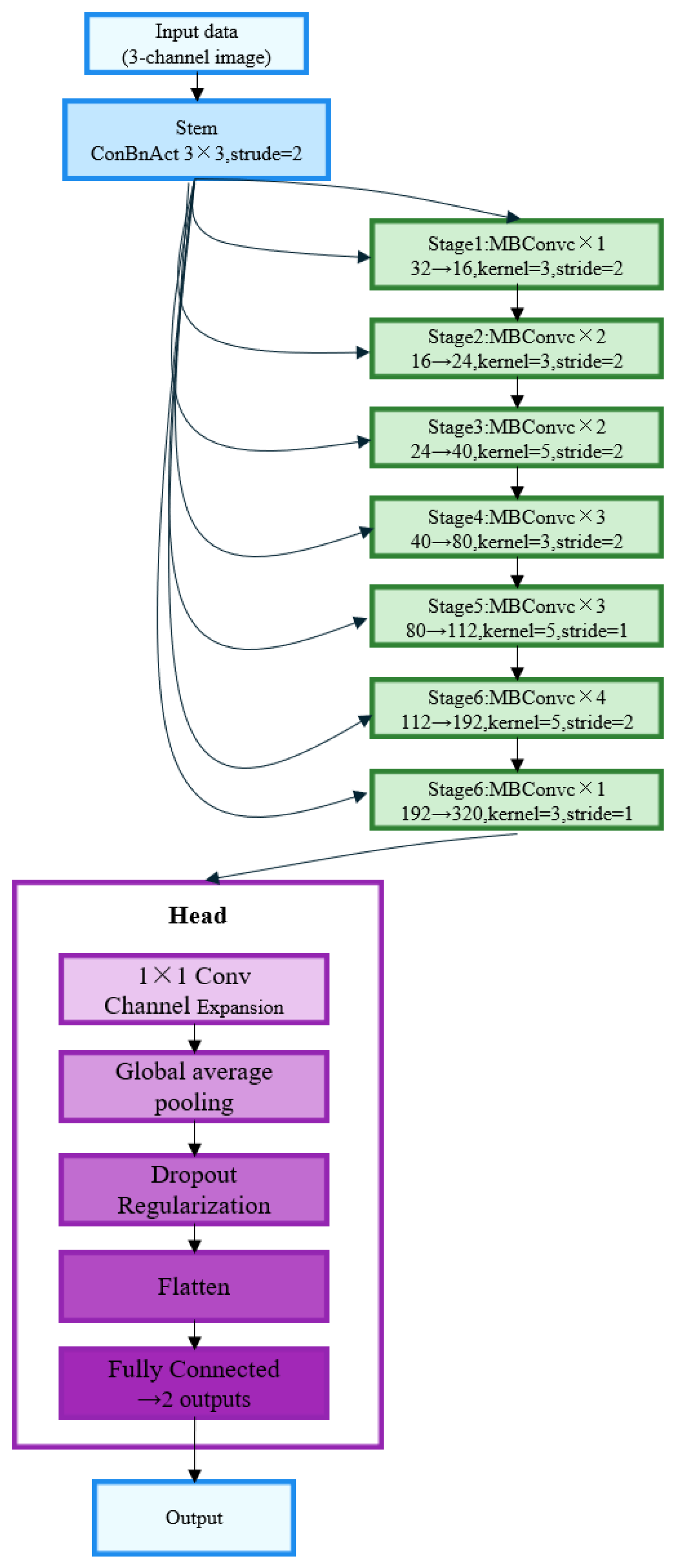 52] is an efficient convolutional neural network proposed by Google Research. Its core achieves excellent performance and parameter efficiency through a composite scaling method (simultaneously optimizing network depth, width, and resolution). The model uses the MBConv module (including depthwise separable convolution and Squeeze-Excite attention mechanism) and the Swish activation function, which significantly reduces the number of parameters while maintaining strong feature extraction capabilities.