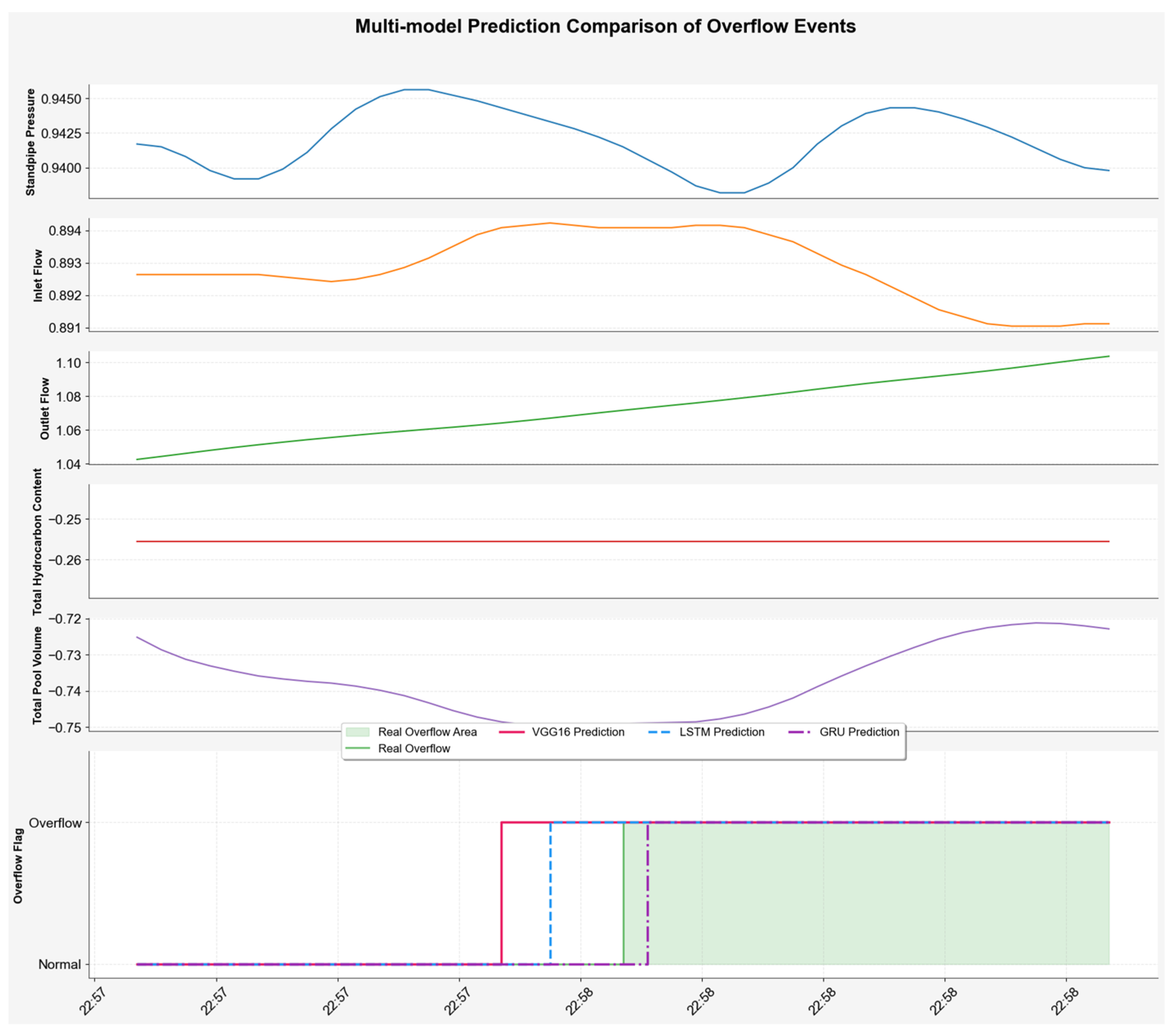 Figure 11, show that the VGG model issued a kick warning early in the initial phase, when the total pool volume only slightly increased. In comparison, while the LSTM model also issued a warning earlier, its lead time was not as significant as that of the VGG16 model. This demonstrates its strong sensitivity and discriminative ability in capturing early features of abnormal trends, demonstrating excellent risk perception performance.
